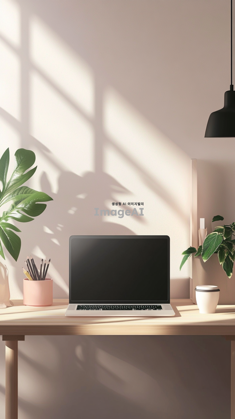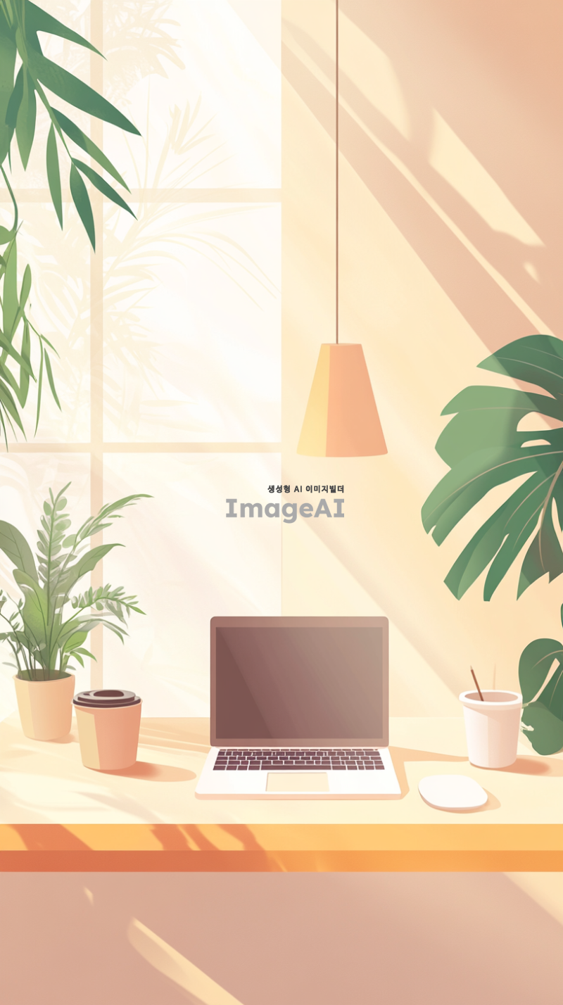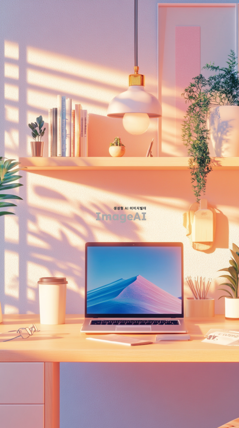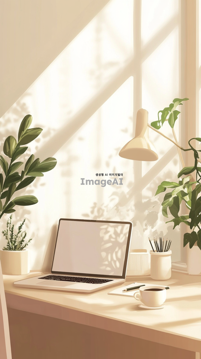 아늑하고 현대적인 데스크테리어를 배경으로 한 스마트폰 배경화면, 따뜻한 조명 아래 깔끔하게 정리된 책상 위에 노트북, 식물, 커피잔이 놓여 있는 모습, 배경은 부드러운 파스텔 색상으로 조화롭게 구성되어 있으며, 편안한 분위기를 강조, 한국의 감성을 담은 디자인.