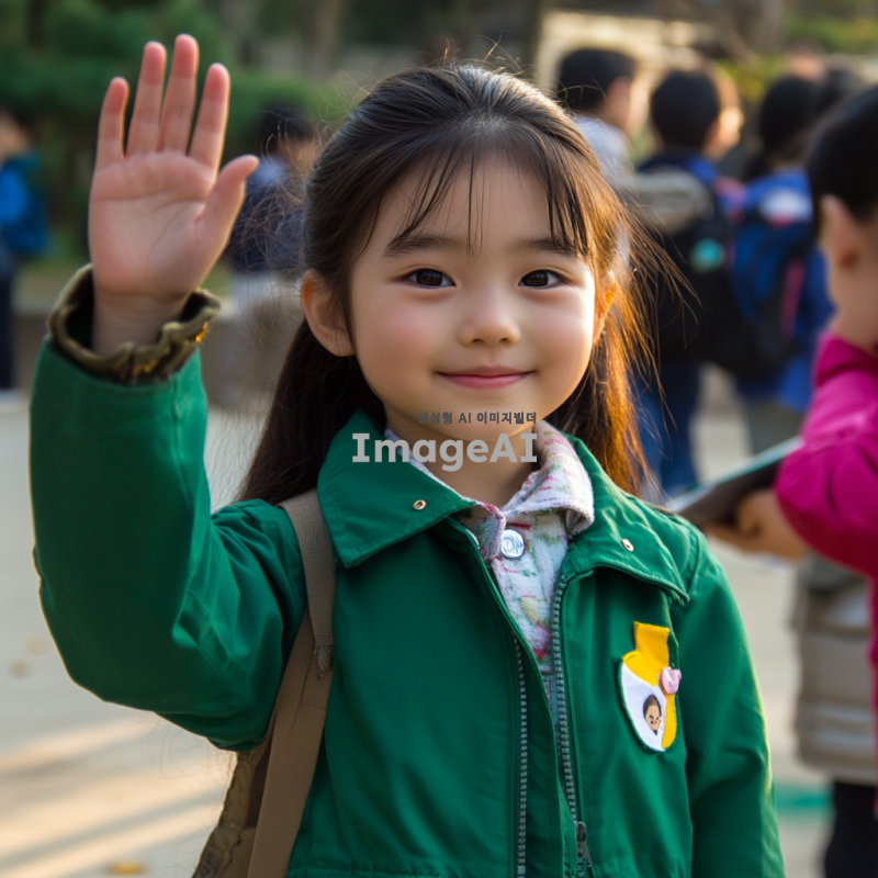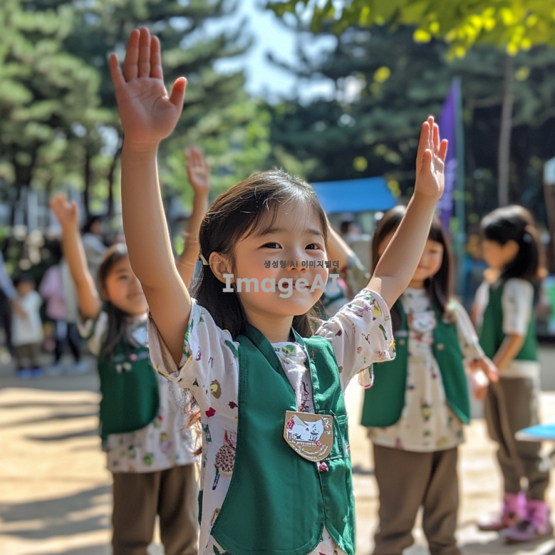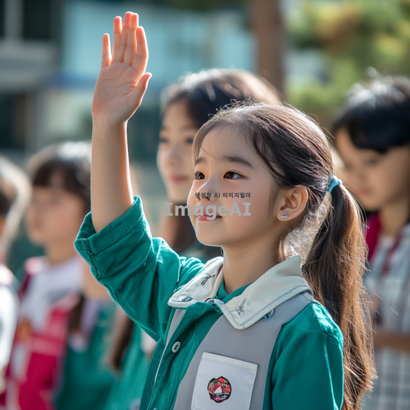 한국의 걸스카우트 활동을 하는 어린 소녀가 학교운동장에서 스카우트 선서하는 모습,