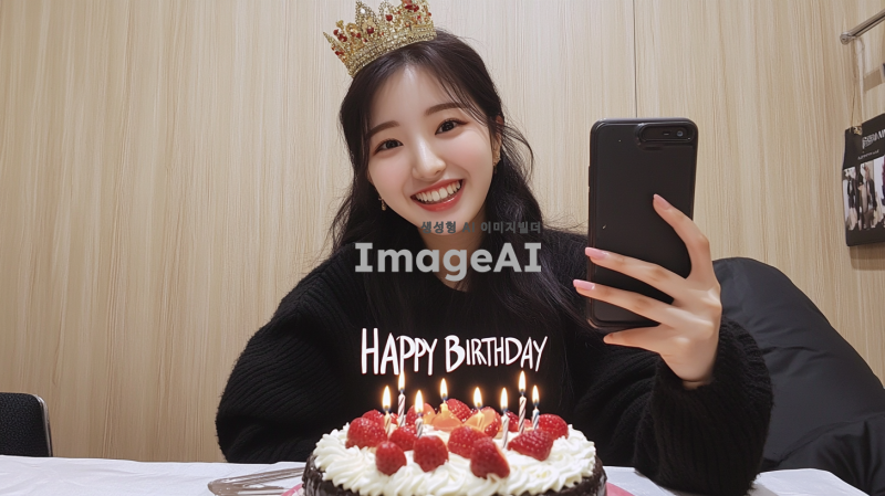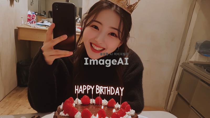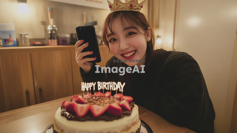 한국 여성 한 명이 생일 케이크가 앞에 놓인 테이블에 앉아 웃고 있으며, 머리에 왕관을 쓰고 있습니다. 그녀는 전화를 들고 "HAPPY BIRTHDAY" 사인을 만들며 셀카를 찍고 있습니다. 그녀는 검은 스웨터를 입고 있으며, 배경은 작고 깔끔한 스타일의 방입니다. 이 여성은 아름다운 20세 한국 소녀이며, 케이크는 초콜릿 퐁듀 층 위에 딸기 조각으로 장식되어 있고 촛불이 켜져 있습니다.