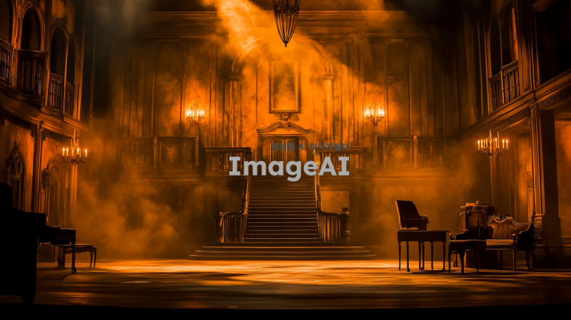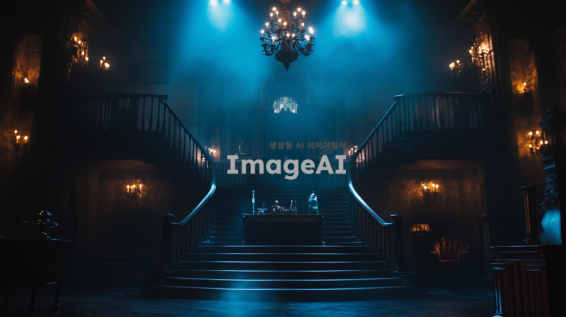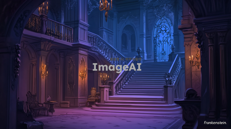 어두운 분위기의 고딕 양식의 실내 배경, 웅장한 성의 내부, 석조 벽과 고풍스러운 조명, 음침한 분위기 속에 미세한 안개가 감도는 모습, 중앙에 큰 계단이 있고, 고전적인 가구와 장식품들이 배치된 장면, 뮤지컬 "프랑켄슈타인"의 분위기를 살리기 위해 신비로운 느낌을 강조한 이미지.