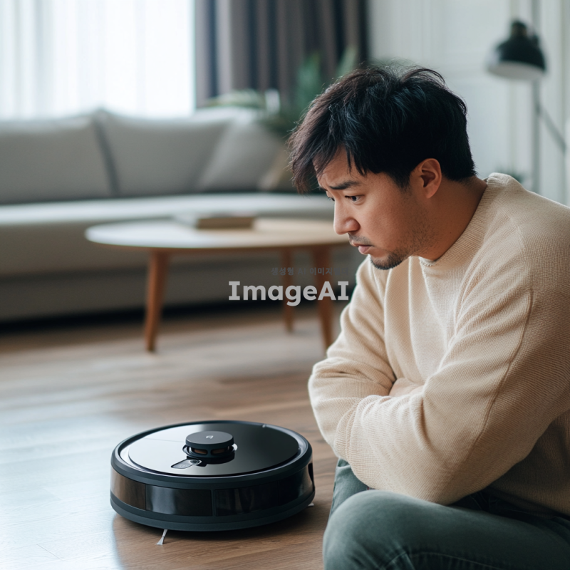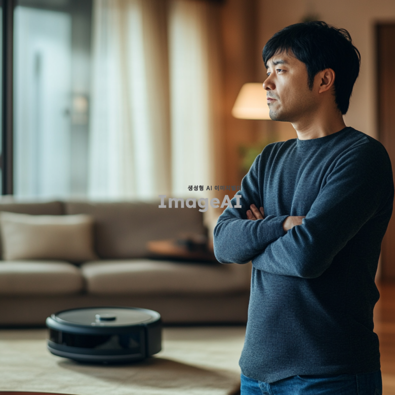 로봇청소기가 느리게 청소하는 모습을 지켜보며 답답해하는 외국인 남성. 집안은 깔끔하지만 로봇청소기가 한 곳에서 머물며 청소하는 모습. 남성은 팔짱을 끼고 불만스러운 표정을 짓고 있으며, 배경에는 거실의 소파와 커피 테이블이 보인다. 조명은 따뜻하고 아늑한 분위기를 연출하고 있다.
