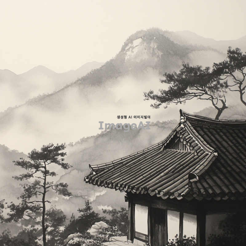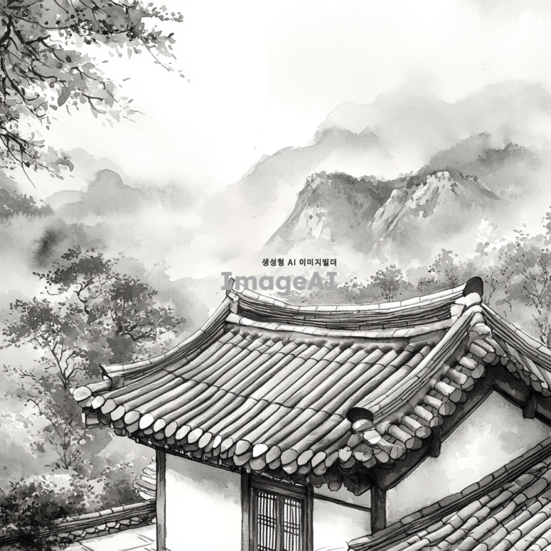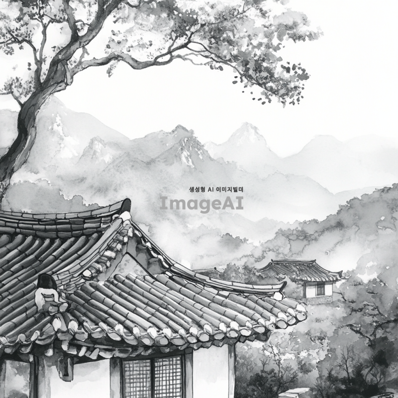 수묵화 스타일의 흑백 그림으로 표현된 한국의 전통 풍경, 고택과 자연이 어우러진 모습, 부드러운 선과 음영을 강조하여 고요하고 평화로운 분위기를 자아내는 장면, 전통 한옥의 지붕과 주변의 산과 나무들이 어우러진 풍경.