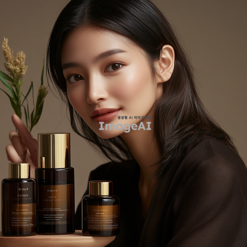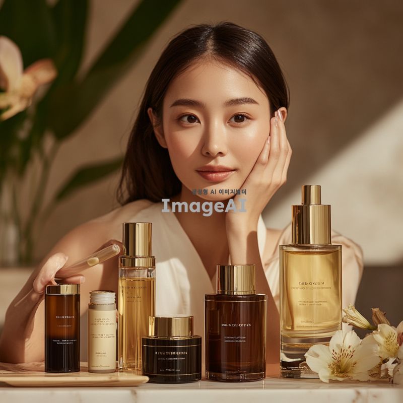 동양인 여성 모델이 다양한 스킨케어 제품을 사용하며 피부를 관리하는 모습, 자연광 아래에서 촬영된 세련된 스튜디오 배경, 부드러운 표정과 건강한 피부, 고급스러운 스킨케어 제품들이 배치된 장면, 현대적이고 세련된 느낌의 스타일링, 피부의 질감이 잘 드러나는 클로즈업 샷.