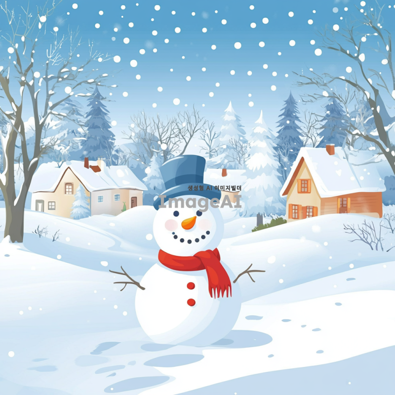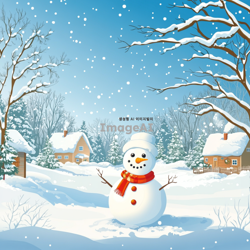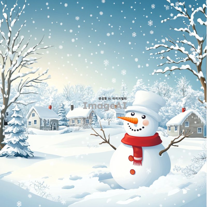 눈사람이 서 있는 겨울 풍경, 하얀 눈으로 덮인 나무와 집들이 배경에 있으며, 눈사람은 당근 코와 버튼으로 장식되어 있고, 빨간색 목도리를 두르고 있다. 맑은 파란 하늘 아래 따뜻한 햇살이 비추고 있는 모습, 주변에는 눈송이가 천천히 내리고 있는 장면.