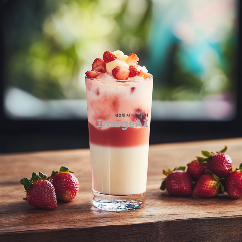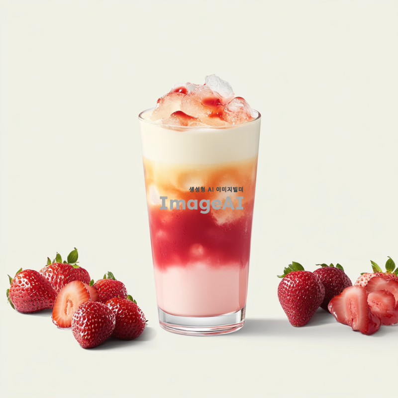 유리잔에 담긴 딸기라떼, 얼음이 살짝 비치고, 음료의 밑에서 2분의 1 지점까지는 부드러운 우유로 가득 차 있으며 그 위에는 달콤한 딸기 시럽이 올려져 있는 모습. 두 층의 경계가 흐트러져 자연스럽게 어우러진 느낌을 강조하여, 상큼하고 맛있는 분위기를 담아낸 이미지.