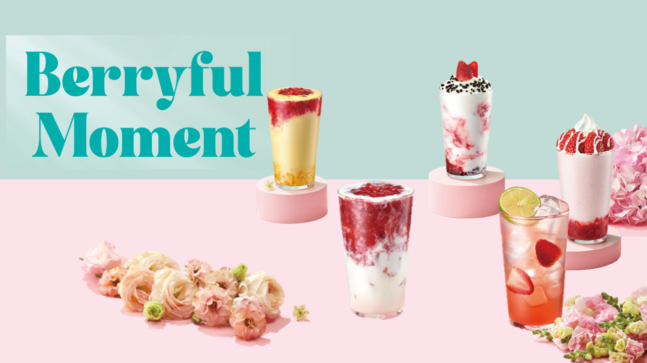 유리잔에 담긴 딸기라떼 얼음이 살찍 비치고 음료의 밑에서 2분의 1 지점까지는 우유로 차있고 그 위는 딸기 시럽이 올려져있다 그 경계가 흐트러져 자연스러움을 더한다