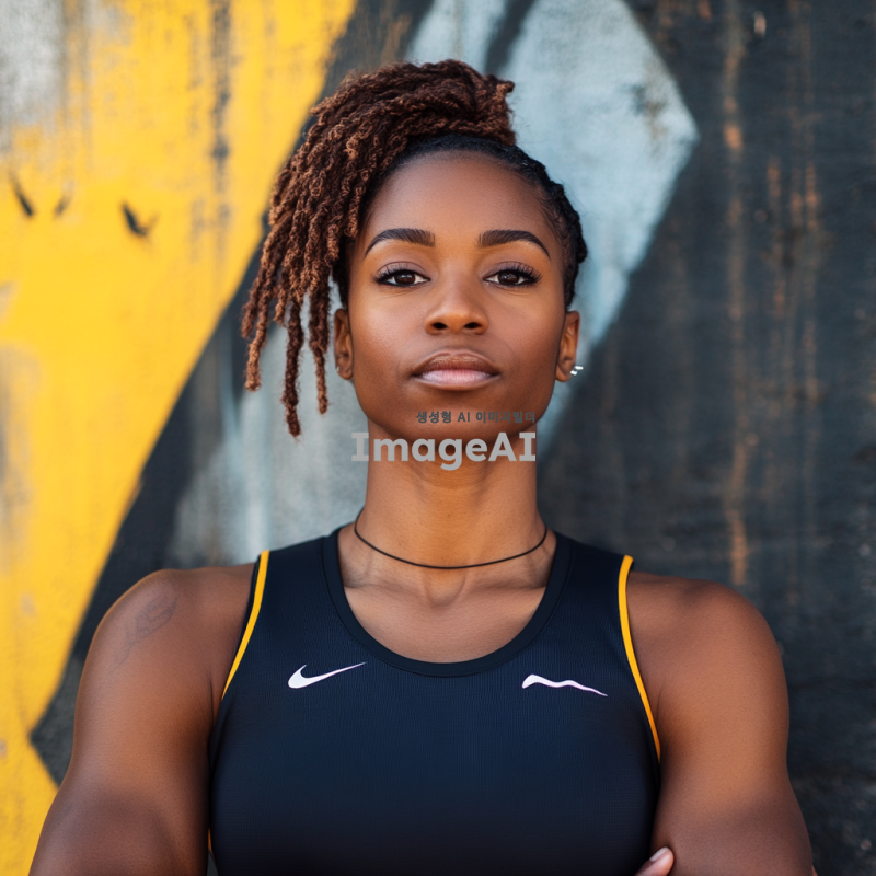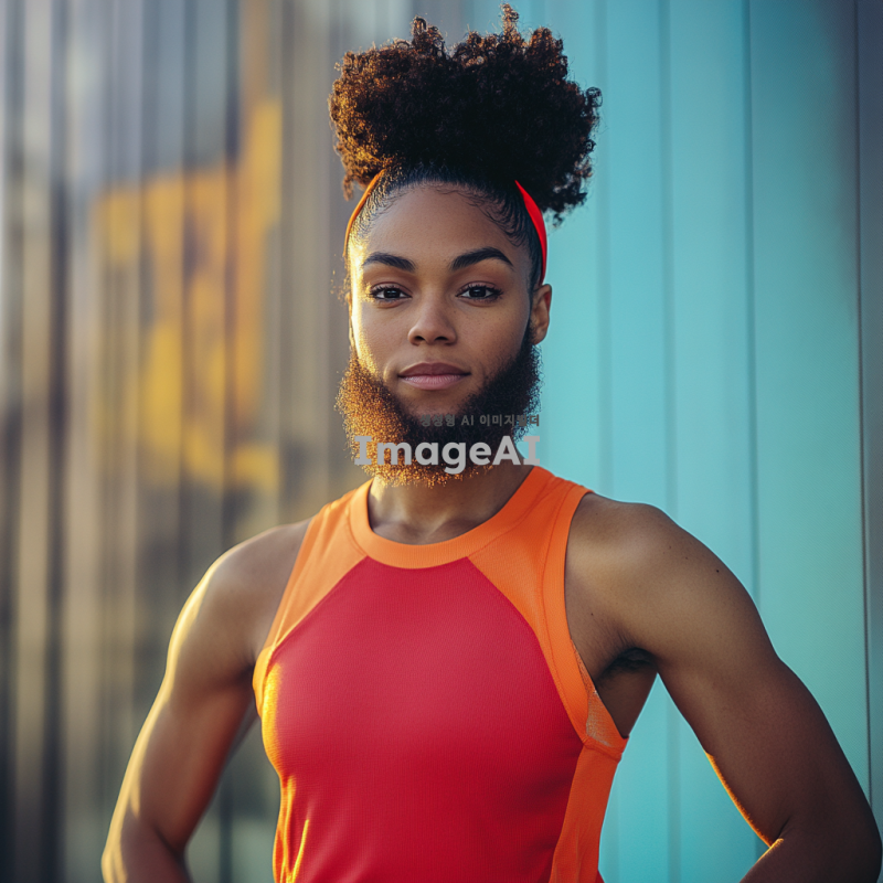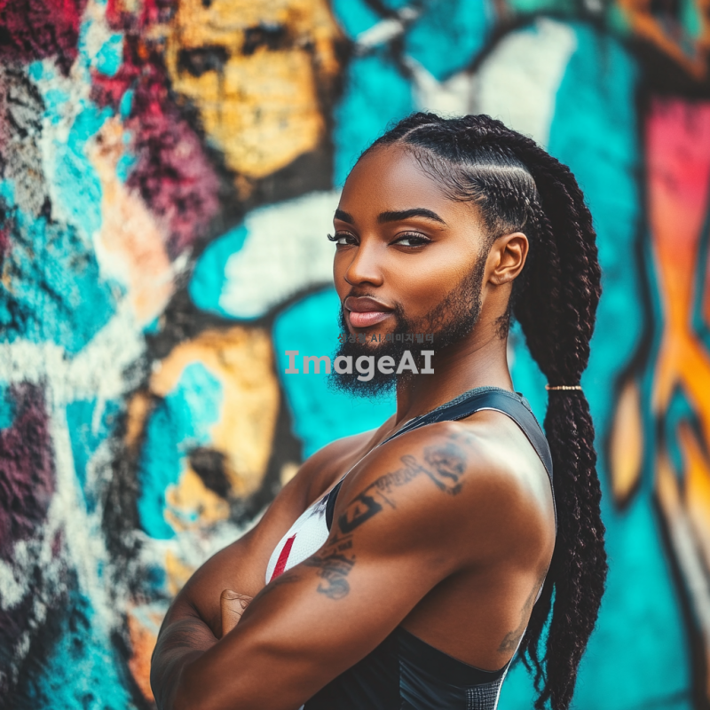 흑인 여성, 르브론 제임스의 특징을 가진 턱수염을 가진 모습, 강한 인상과 자신감 넘치는 표정, 스포츠 의상 착용, 배경은 도시, 역동적인 포즈, 스포티한 스타일.