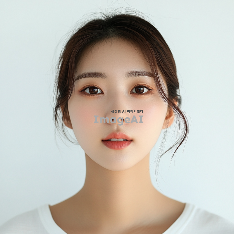 화장품 모델로서 자연광 아래에서 하얀 배경을 배경으로 한 한국 20대 여성의 상반신 이미지. 긴 머리를 가진 여성의 부드러운 표정과 자연스러운 메이크업을 강조하여 화장품의 매력을 전달하는 모습.