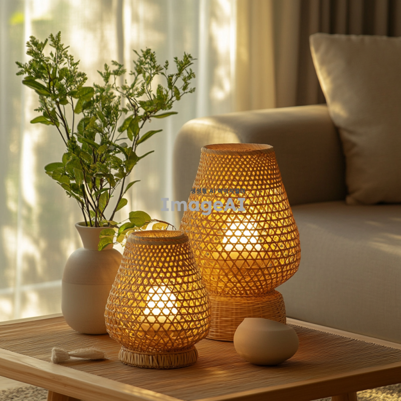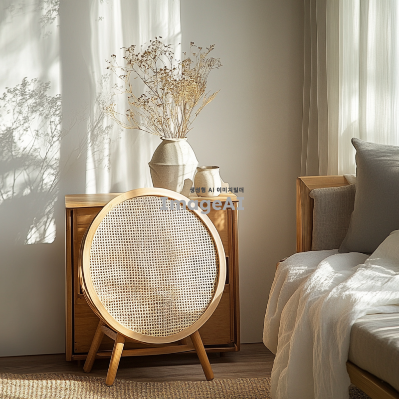라탄으로 만들어진 아름다운 받침, 자연스러운 색감과 질감이 돋보이는 디자인, 한국의 전통적인 요소가 가미된 형태, 실내 인테리어에 잘 어울리는 스타일, 따뜻하고 아늑한 분위기를 연출하는 소품, 부드러운 조명 아래에서의 모습, 세밀한 디테일과 정교한 마감 처리 강조.
