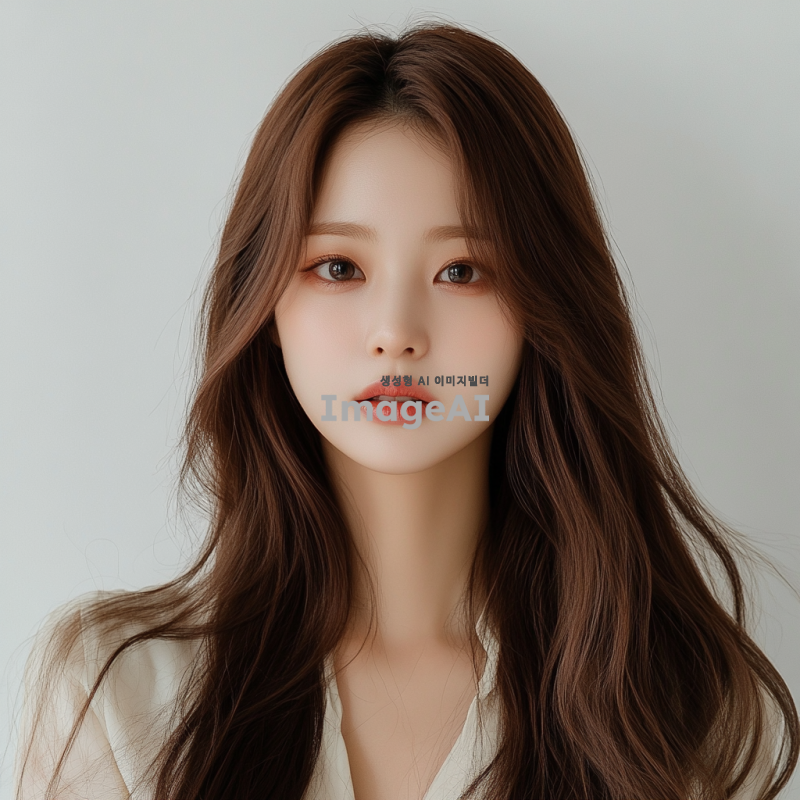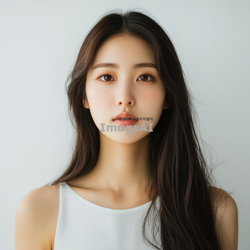 화장품 모델, 장원영을 닮은 한국 20대 여자, 밝은피부, 하얀배경, 자연광, 긴머리, 자연스러운 메이크업. 상반신