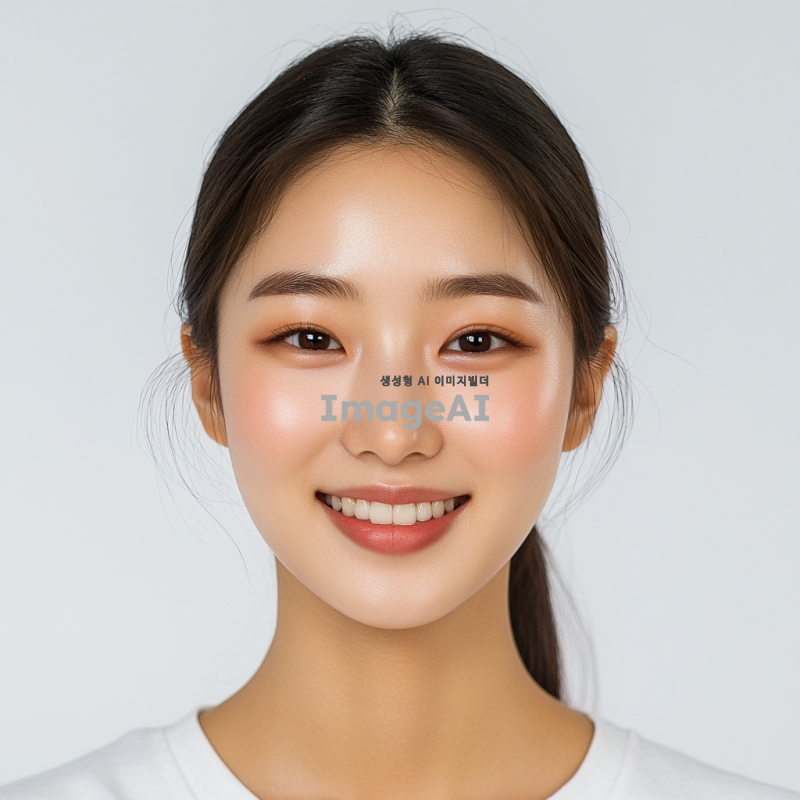 흰색 배경에서 미소 짓고 있는 20대 한국 여성의 상반신 모습. 흰 피부를 가진 그녀는 길고 살짝 웨이브진 머리를 뒤로 넘기고 있으며, 화장품 모델로서의 매력을 발산하고 있다.