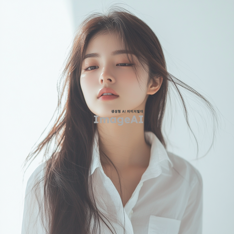 흰 옷을 입고있는 아름다운 20대 한국 여성의 상반신 모습, 자연광의 하얀색 배경, 하얗고 밝고 투명한 피부, 자연스러운 메이크업, 부드러운 표정, 긴 머리는 자연스럽게 흘러내림, 편안한 분위기,