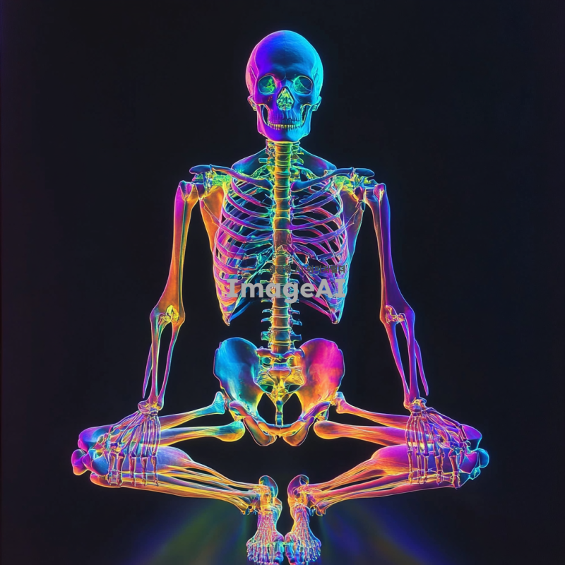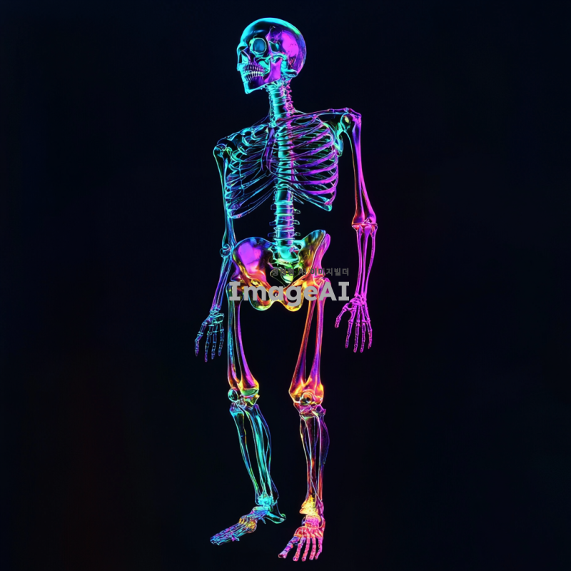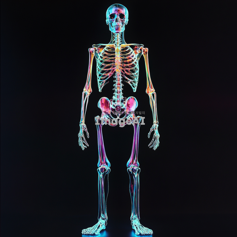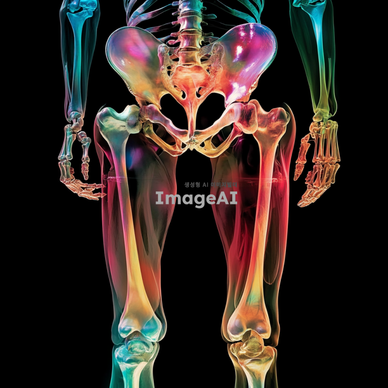 골반이 틀어져 무릎이 돌아가는 인체 골격 사진, 한국인 남성 모델, 해부학적 세부 묘사, 뼈 구조의 명확한 표현, 생생한 색상과 조명 효과, 정면에서 본 모습, 의료 및 교육 목적으로 적합한 이미지