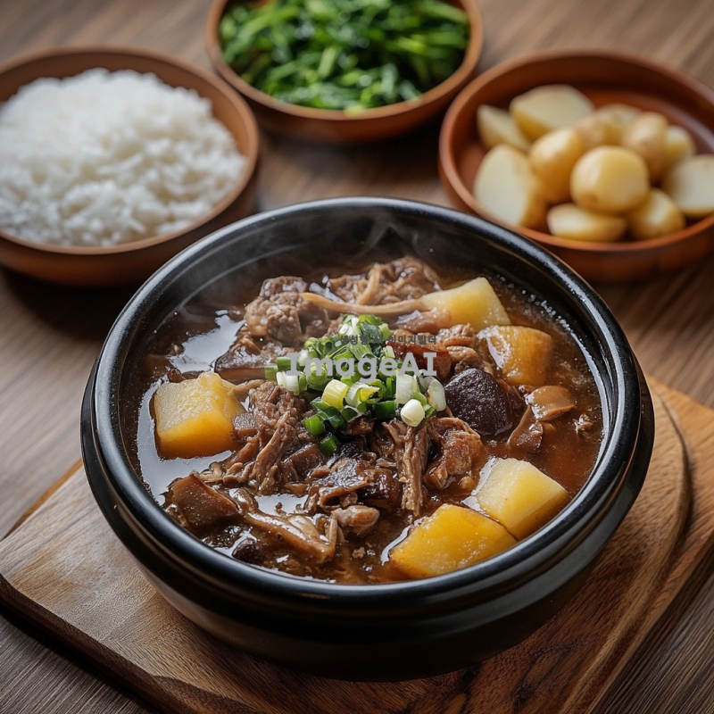 한국 전통 음식인 곱도리탕을 중심으로, 맛있게 조리된 곱도리탕의 모습. 진한 국물에 다양한 재료가 어우러져 있는 모습, 매콤한 양념이 가득한 식탁 위의 아름다운 플레이팅. 주변에 김이 모락모락 나는 밥과 함께, 따뜻한 분위기의 한국식 식사 환경을 강조. 조리 과정에서의 신선한 재료들, 예를 들어 곱창, 닭고기, 감자, 대파 등이 함께 담긴 이미지.