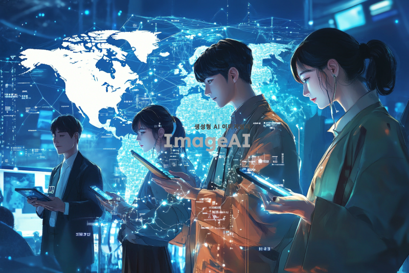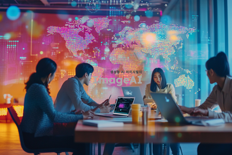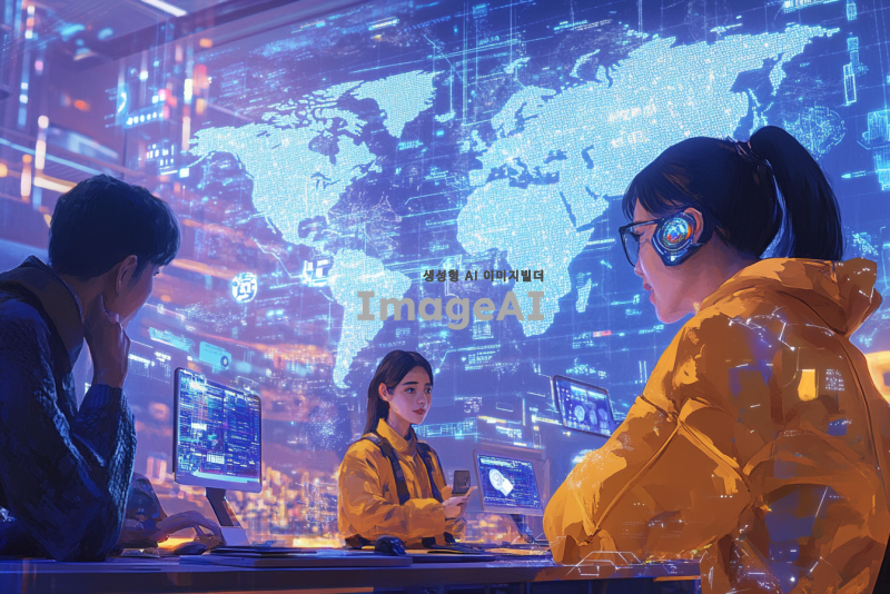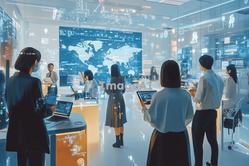 현대적인 사무실 환경에서 다양한 국적의 사람들이 협력하며 AI 기술을 활용하는 모습, 배경에는 세계지도와 디지털 데이터 흐름을 나타내는 그래픽 요소가 포함된 이미지, 사람들은 한국인 스타일의 비즈니스 캐주얼 복장을 하고 있으며, 각자의 디지털 기기를 사용하고 있는 모습, 전체적으로 미래지향적이고 혁신적인 느낌을 주는 색감과 디자인.
