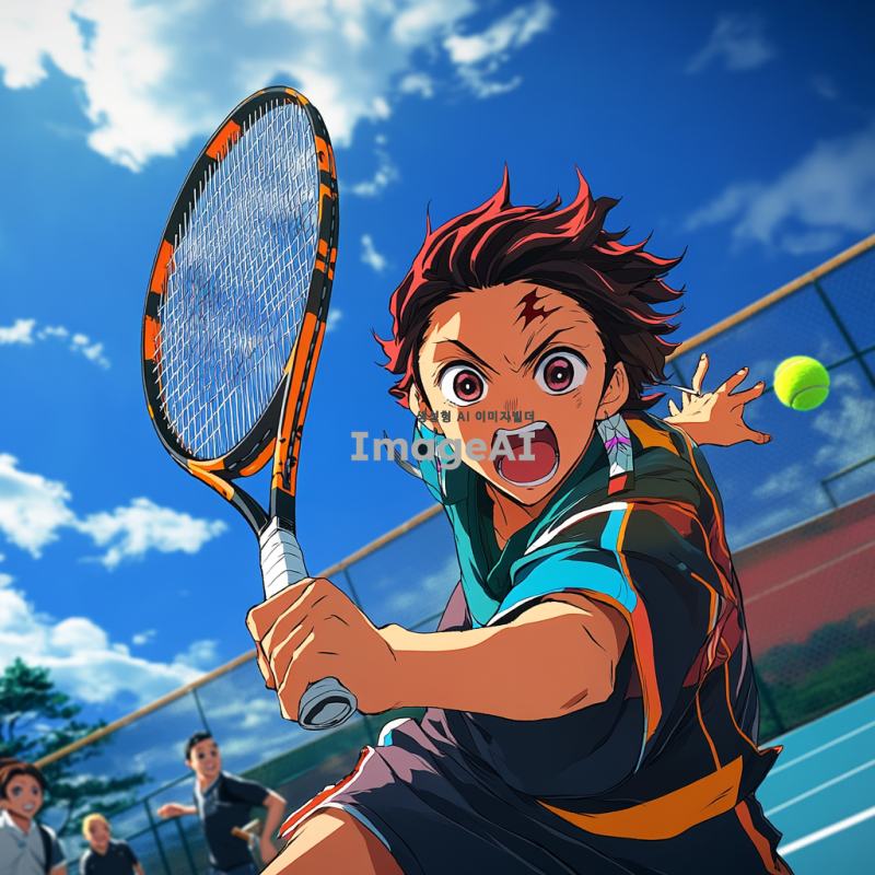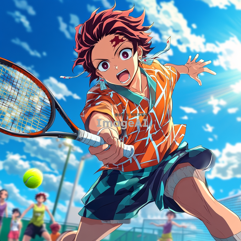 테니스 코트에서 테니스를 치고 있는 귀멸의 칼날의 탄지로, 밝고 활기찬 분위기, 운동복을 입고 라켓을 들고 있는 모습, 배경에는 푸른 하늘과 구름, 주변에는 친구들과 함께하는 즐거운 장면, 애니메이션 스타일, 세밀한 표정과 역동적인 자세 강조