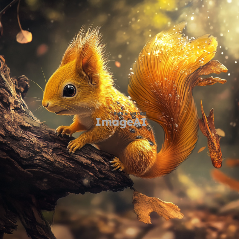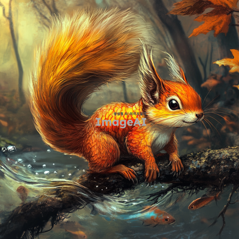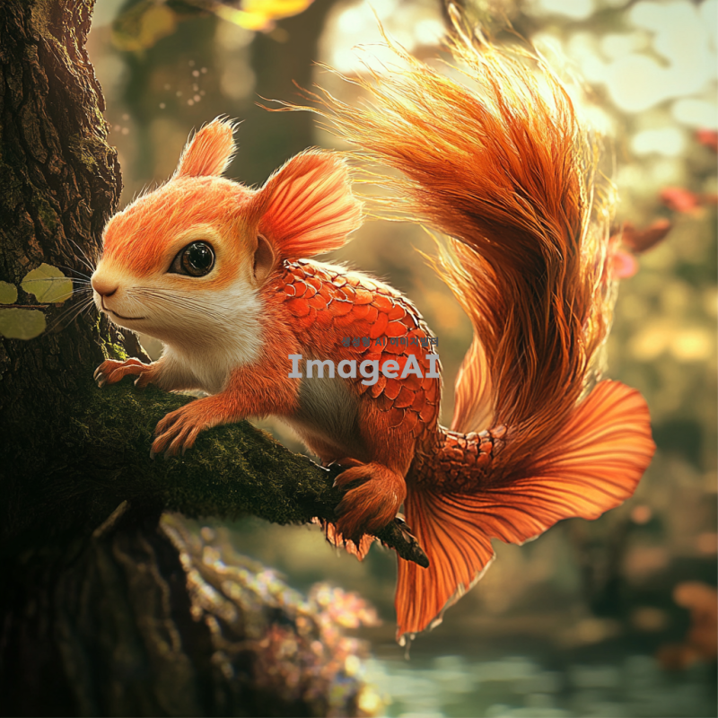 다람쥐와 물고기를 합친 생물, 귀여운 외모의 생물체, 다람쥐의 털과 물고기의 비늘이 조화롭게 섞인 모습, 나무 위에서 수영하는 장면, 자연의 배경, 밝고 생동감 있는 색감, 환상적인 분위기