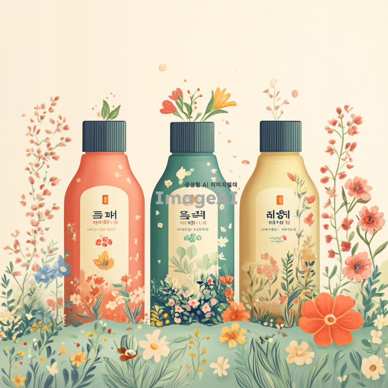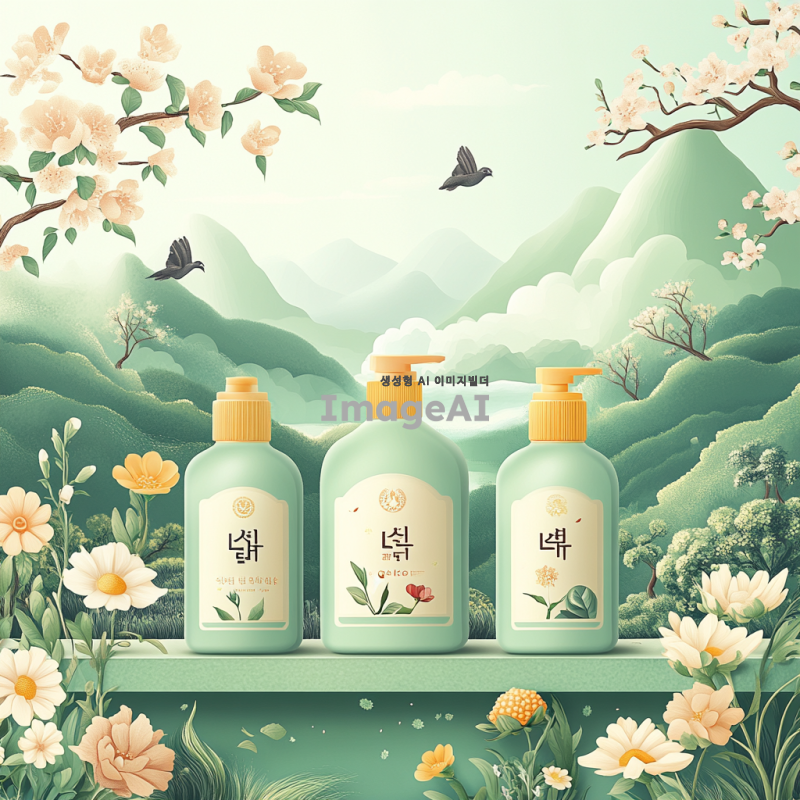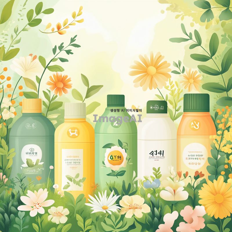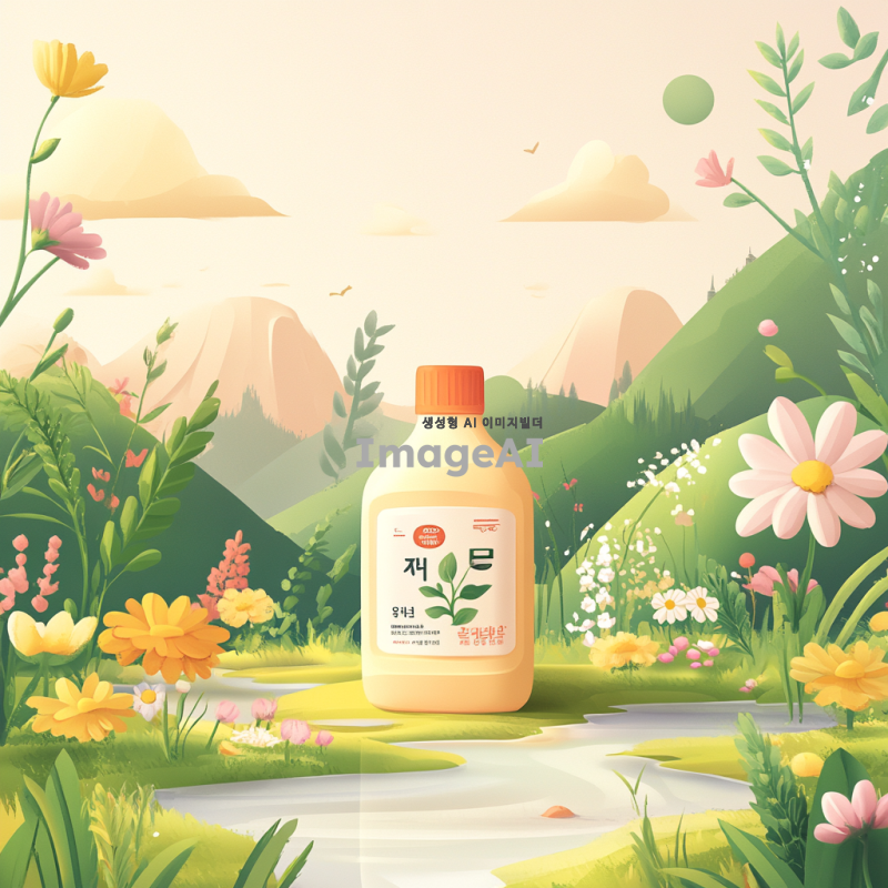 친환경 세제를 주제로 한 일러스트, 자연을 배경으로 한 세제 용기, 식물과 꽃으로 장식된 세제, 부드러운 색상과 따뜻한 느낌, 친환경 마크가 있는 라벨, 깨끗하고 상쾌한 분위기, 한국의 전통적인 요소가 가미된 디자인, 세제를 사용하여 깨끗해진 환경을 표현한 장면.
