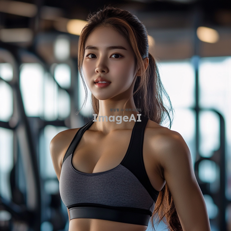 한국인 여성 피트니스 모델이 다양한 핏모델 포즈를 취하고 있는 모습, 건강하고 탄탄한 몸매, 에너지가 넘치는 표정, 헬스장 배경, 운동복 착용, 자연스러운 조명, 역동적인 자세, 운동에 대한 열정을 표현하는 이미지