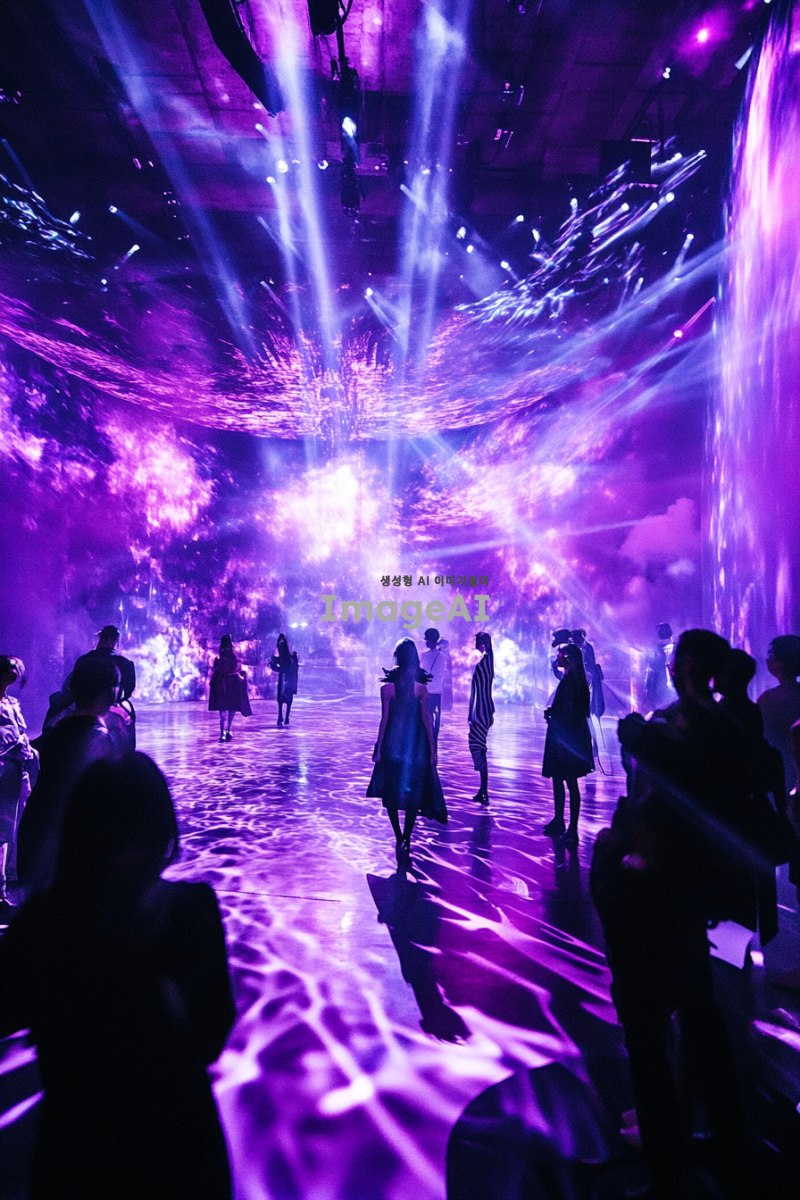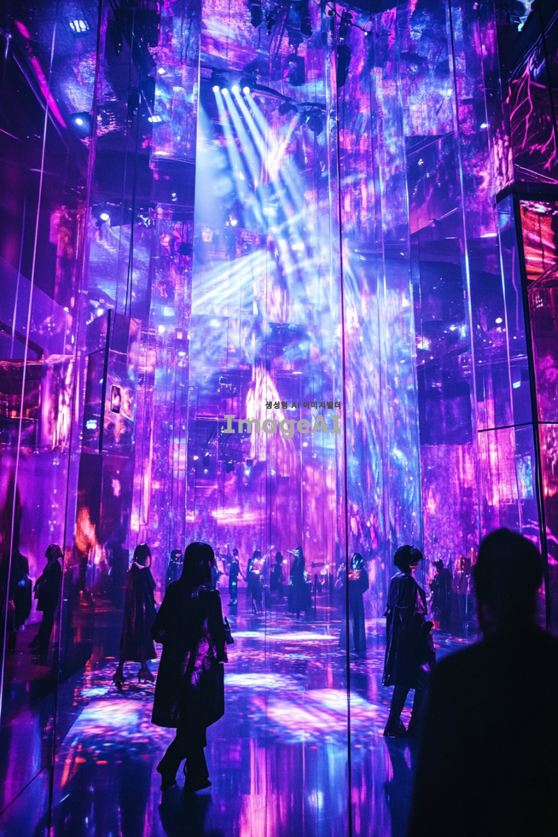 패션 브랜드들이 함께 모여서 서바이벌 경연 프로그램을 펼치고 있는 장면을 그려줘. 모바일 라이브쇼로 송출되는 거라서 세로 화면이면 좋겠고 전체 세트장의 컬러는 진한 보라색을 메인으로 하면 좋겠어