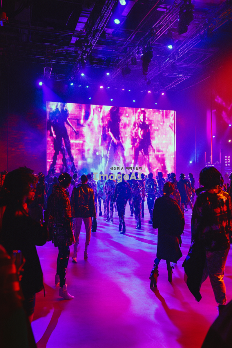 패션 브랜드들이 함께 모여 서바이벌 경연 프로그램을 펼치는 장면, 모바일 라이브쇼로 송출되는 세로 화면, 전체 세트장의 컬러는 진한 보라색, 다양한 패션 아이템과 모델들이 등장하는 역동적인 분위기, 관객들이 응원하는 모습, 조명이 화려하게 비추는 장면.