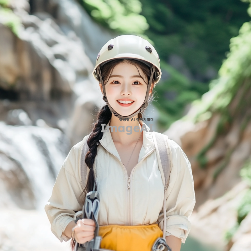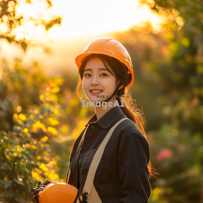 안전모를 쓰고 태극기를 들고 있는 한국 소녀, 밝은 미소를 지으며 주변의 자연 풍경 속에 서 있는 모습, 햇살이 비추는 따뜻한 분위기, 한국 전통의 아름다움이 느껴지는 배경, 소녀의 의상은 현대적이면서도 전통적인 요소가 가미된 스타일, 생동감 있는 색감과 조화로운 구도.