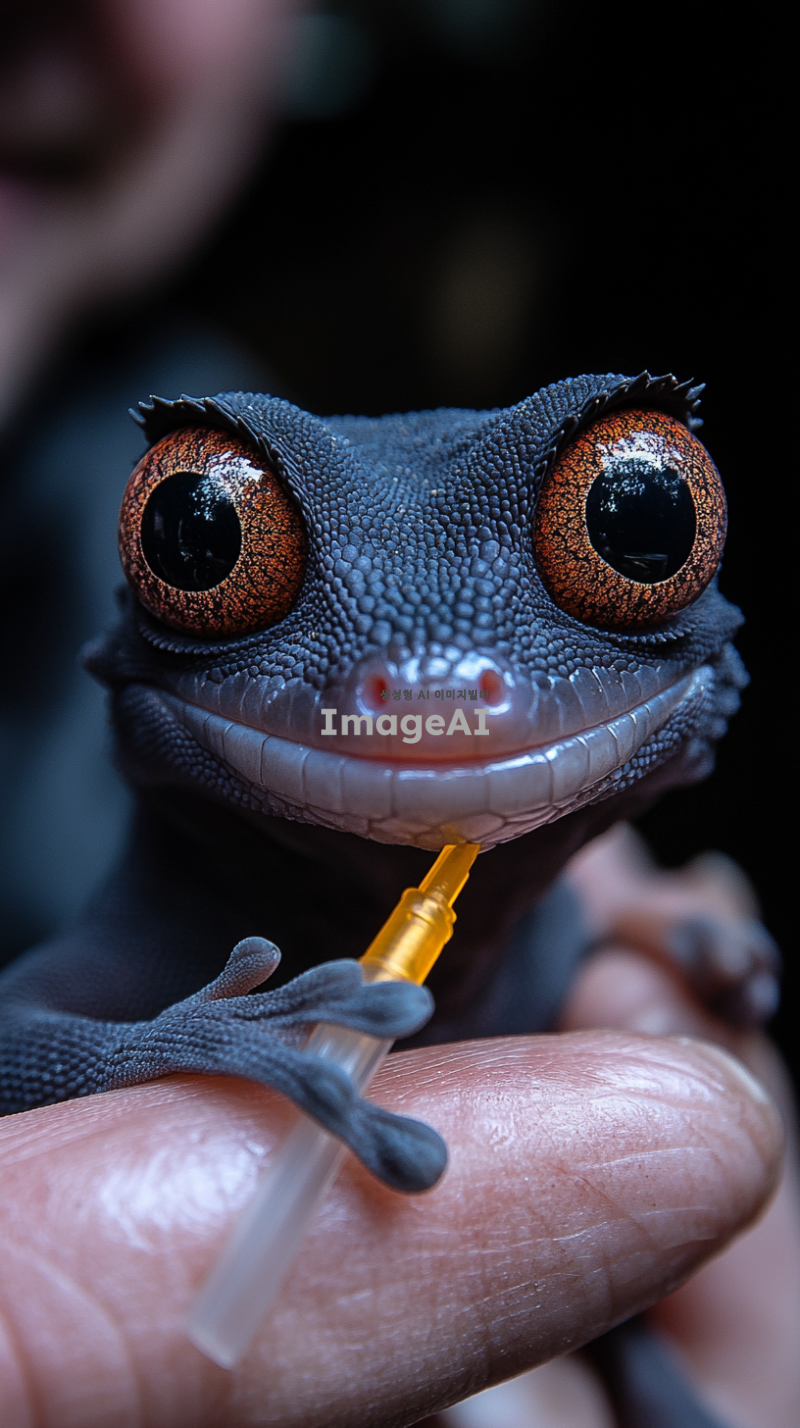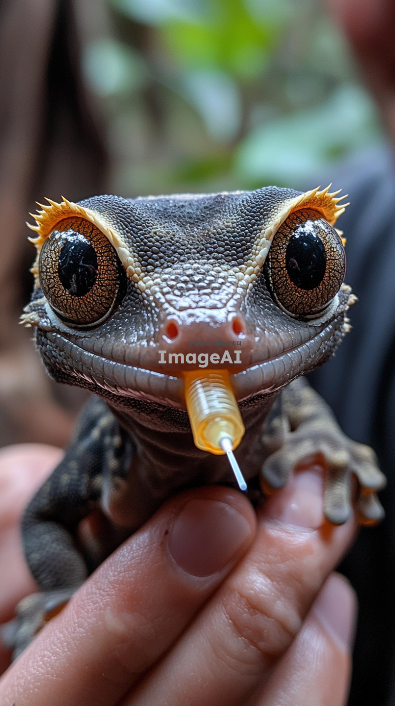 "A close-up of a small dark-colored crested gecko with large eyes and a slightly curled tail, sitting on a person's hand. The gecko is being fed from a syringe containing a golden-colored liquid, and it is licking the tip of the syringe. The background is slightly blurred, with a person's arm visible. The lighting is soft and natural, giving a warm and intimate feel to the scene."