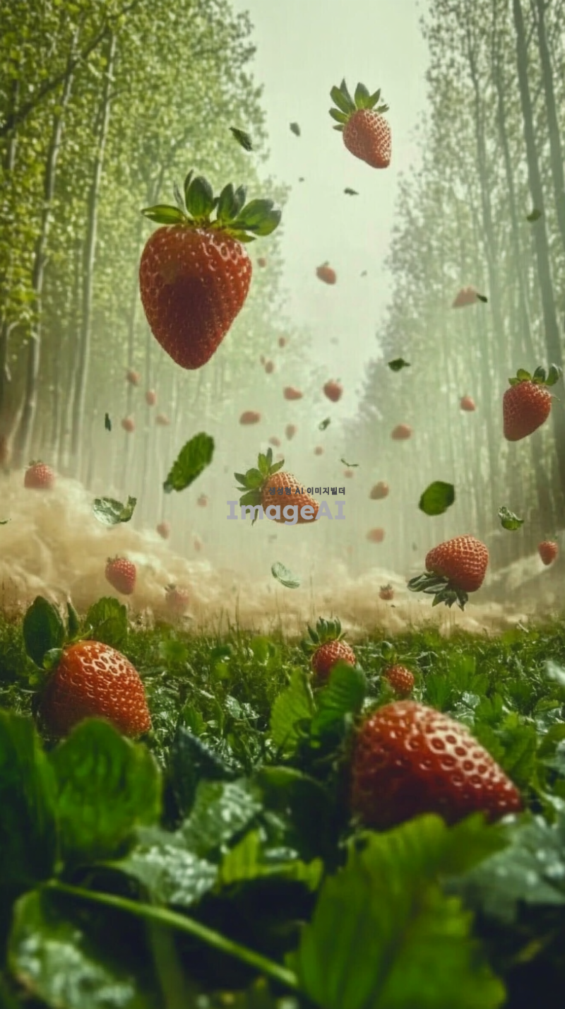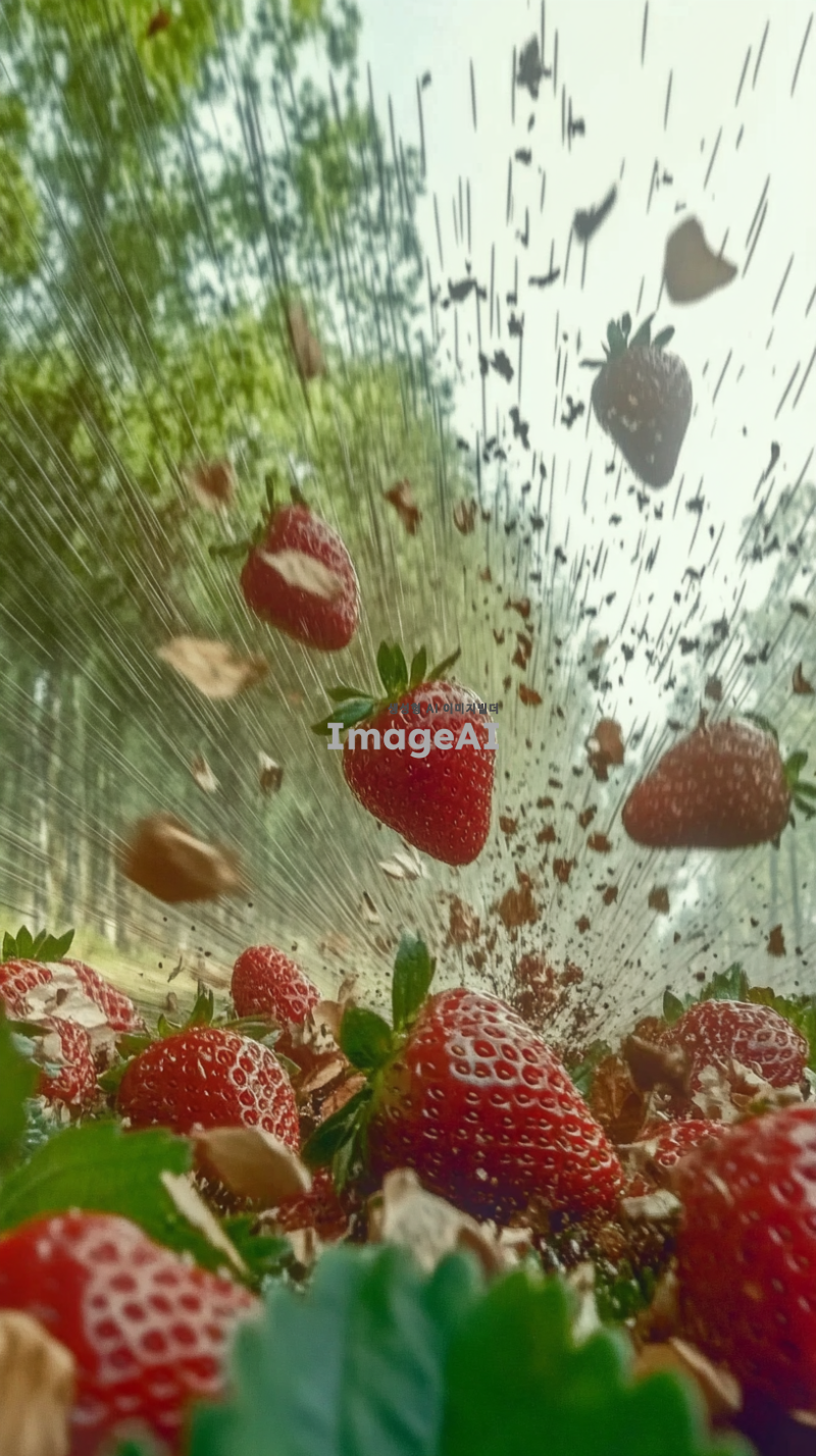 화려한 배경 위에 하늘에서 쏟아지는 신선한 딸기들, 다양한 색상의 꽃들과 푸른 나무들이 어우러진 풍경, 햇살이 비추는 따뜻한 분위기, 생동감 넘치는 자연의 아름다움, 상상력을 자극하는 환상적인 장면.