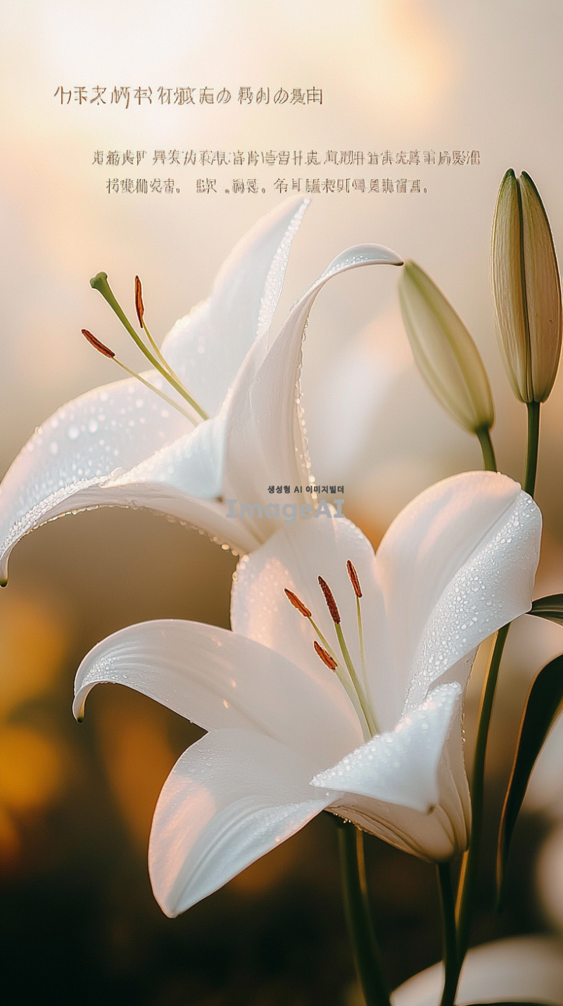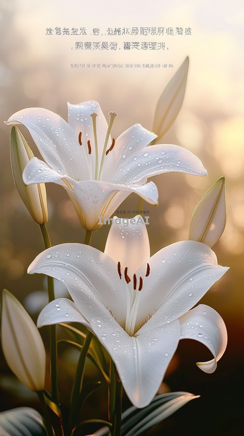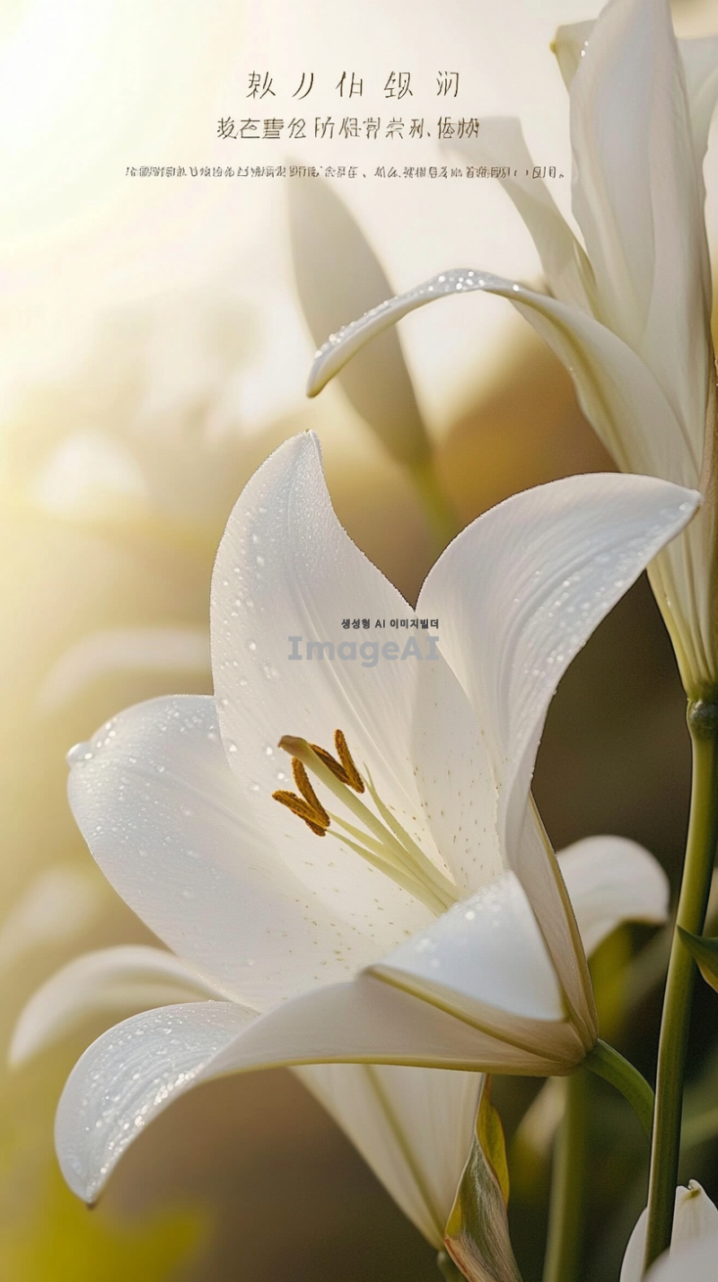 청순한 백합꽃이 부드럽게 피어오르는 장면, 햇살에 반사되는 물방울과 함께 꽃잎이 하나씩 열리는 모습, 배경은 흐릿한 자연 풍경, 따뜻한 색감의 조화, 평화롭고 serene한 분위기, 섬세한 디테일이 강조된 이미지.