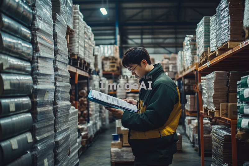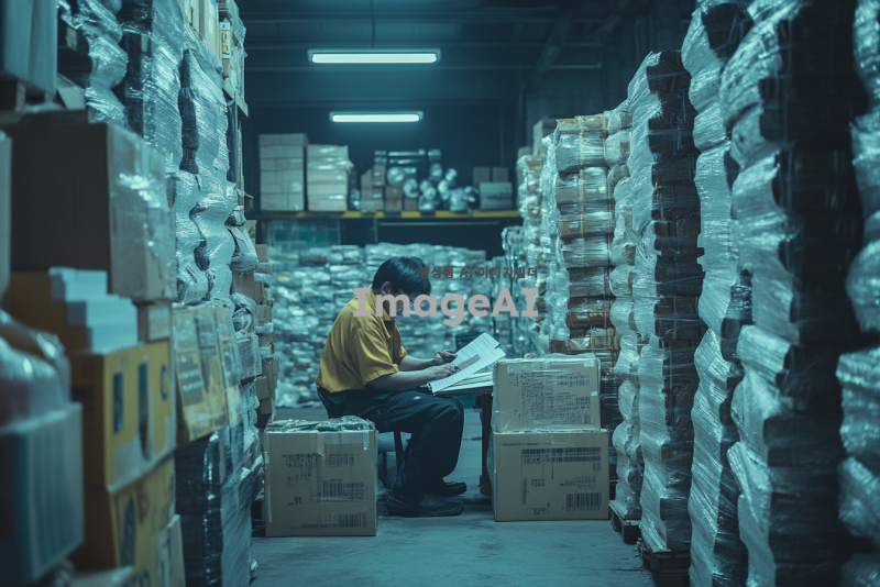 비철금속 산업 시장의 복잡한 거래 환경을 강조하는 이미지, 다양한 비철금속 제품들이 쌓여 있는 창고의 모습, 창고 내부는 어두운 조명으로 분위기를 아늑하게 하고, 한쪽에는 비철금속 주문서를 작성하는 한국인 직장인의 뒷모습, 그의 표정은 고민에 차 있으며, 주변에는 비철금속 관련 서적과 자료들이 흩어져 있는 모습, 산업의 어려움을 상징적으로 나타내는 배경 요소 추가.