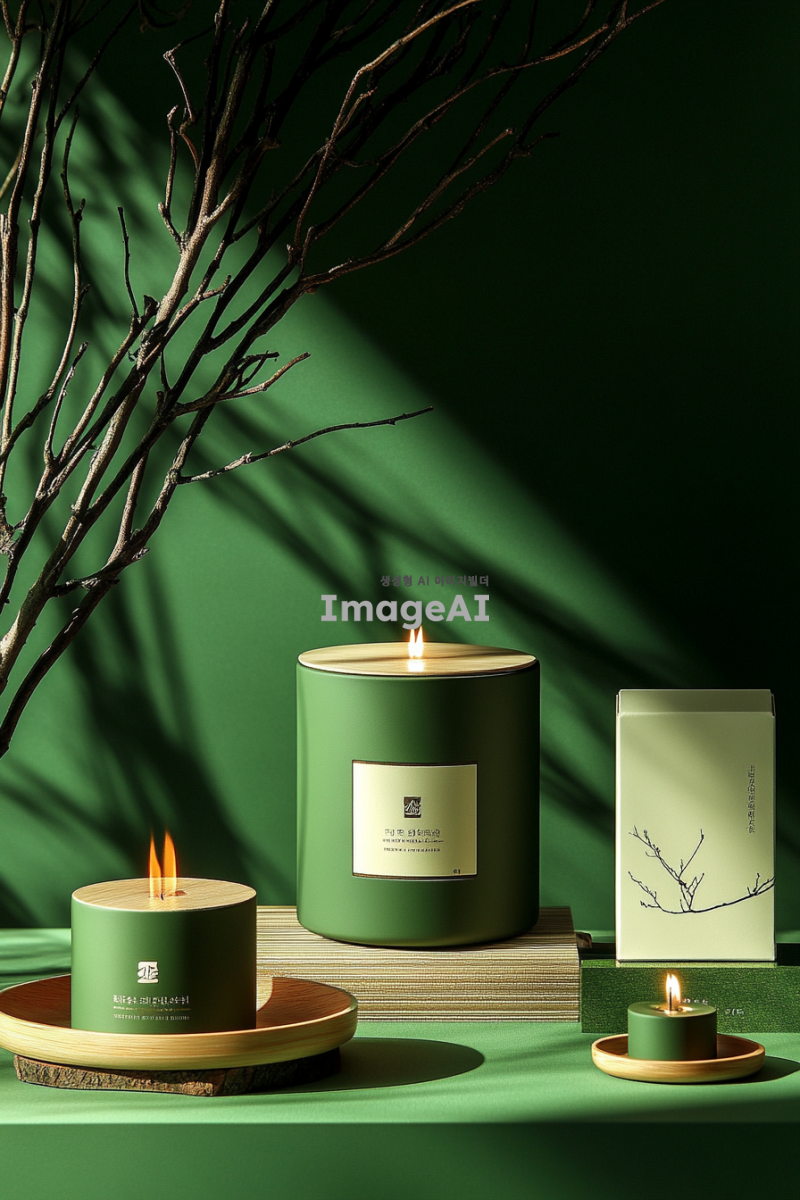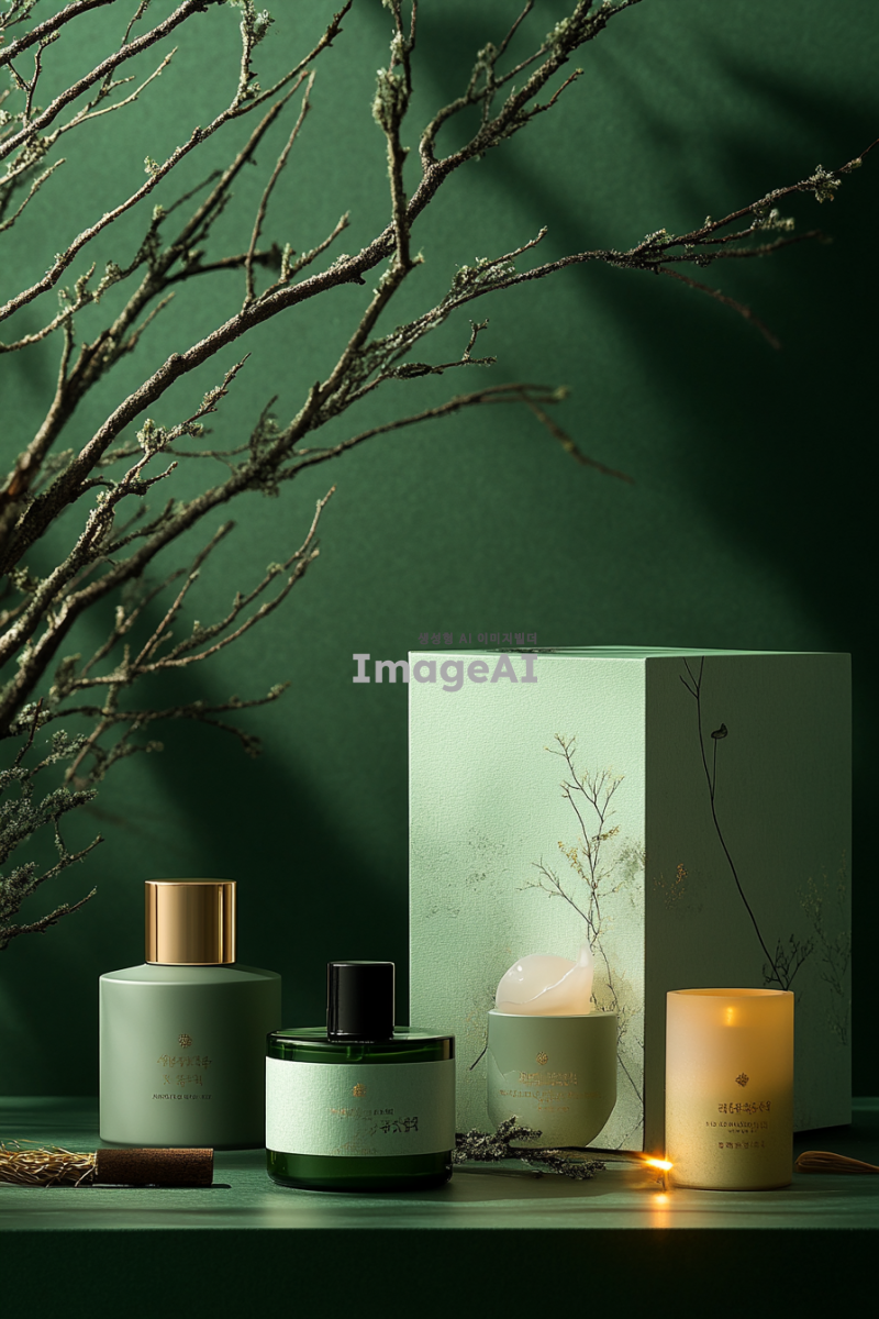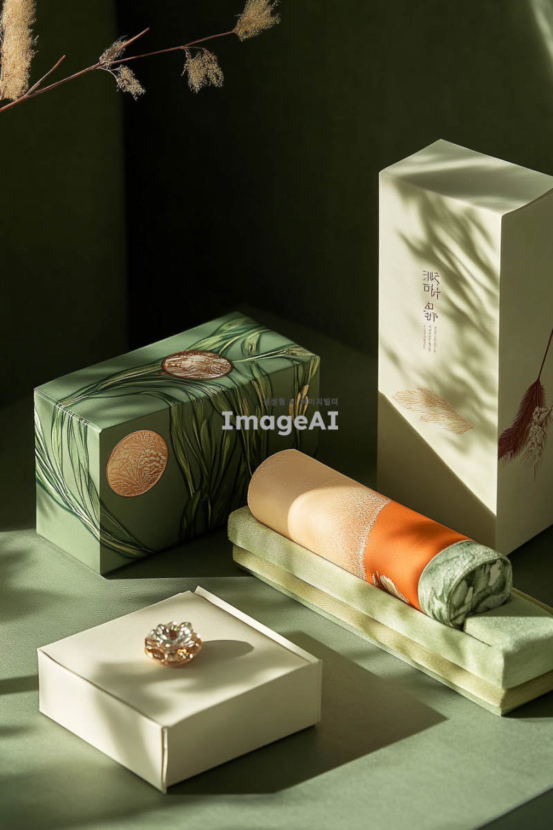 따뜻한 초록색 배경 위에 아름답게 디자인된 악세사리 포장 패키지, 자연적인 요소가 어우러진 모습, 부드러운 조명 아래에서 반짝이는 악세사리, 친환경적인 느낌을 주는 재료와 패턴, 세련되고 현대적인 스타일, 한국의 전통적인 디자인 요소가 섞인 패키지 디자인, 전체적으로 따뜻하고 아늑한 분위기.
