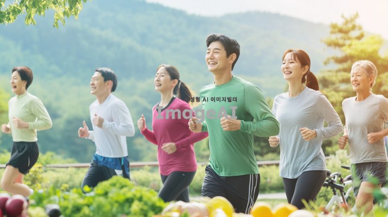 존2러닝과 건강의 관계를 주제로 한 PPT 표지 사진. 배경은 자연 풍경으로, 푸른 숲과 맑은 하늘이 어우러진 장면. 중앙에는 다양한 연령대의 한국인들이 조깅하거나 걷고 있는 모습. 사람들은 건강한 미소를 지으며 활동적인 자세를 취하고 있으며, 주변에는 운동 기구와 건강한 식품들이 배치되어 있음. 전체적인 분위기는 활기차고 긍정적이며, 건강과 운동의 중요성을 강조하는 느낌.