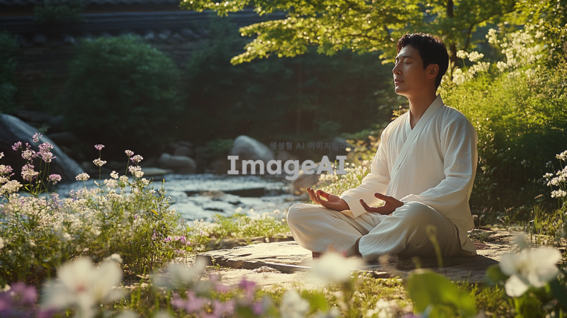 자연 속에서 평화롭게 명상하는 한국인 남성이 따뜻한 햇살 아래에서 나무와 꽃들 사이에 앉아 있는 모습. 주위에는 다양한 식물과 꽃들이 만개해 있어 생명력이 넘치며, 배경에는 부드러운 흐름의 강물이 지나가고 있다. 남성의 표정은 편안하고 평화로우며, 건강한 삶을 상징하는 요소들이 강조되어 있다. 전체적인 분위기는 치유와 안정감을 주는 따뜻한 색조로 표현된다.