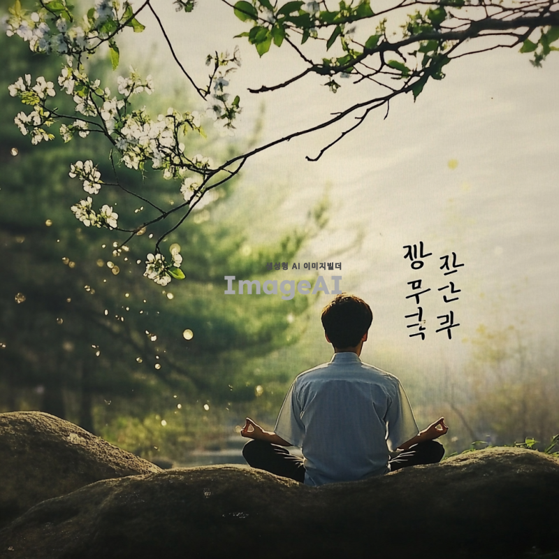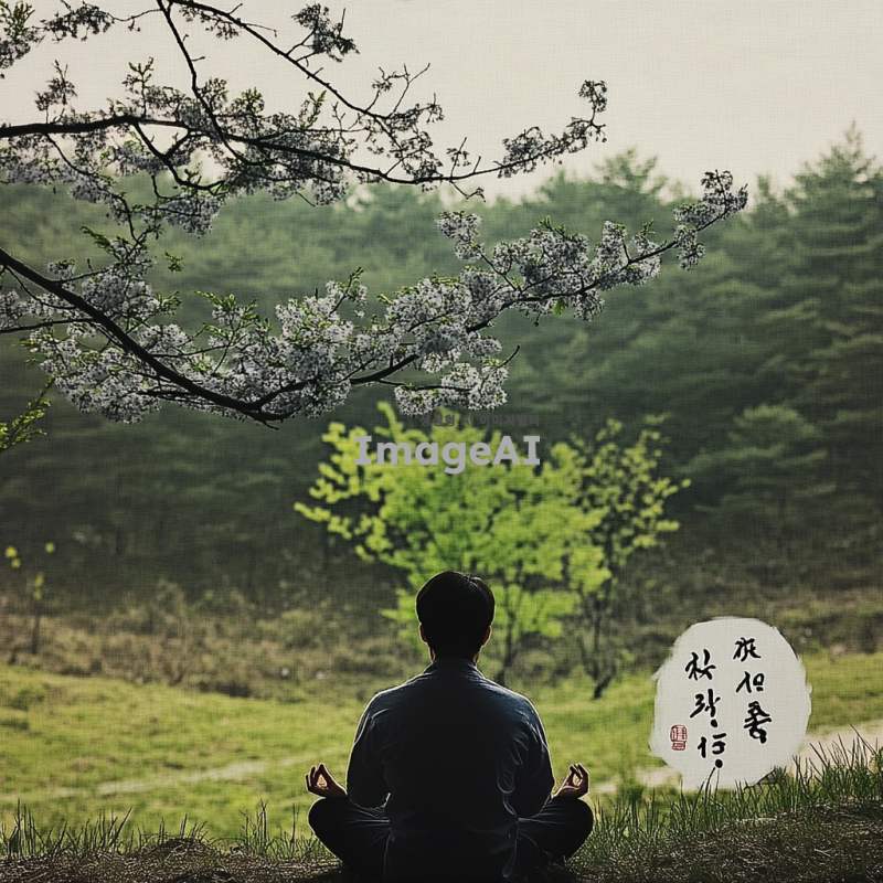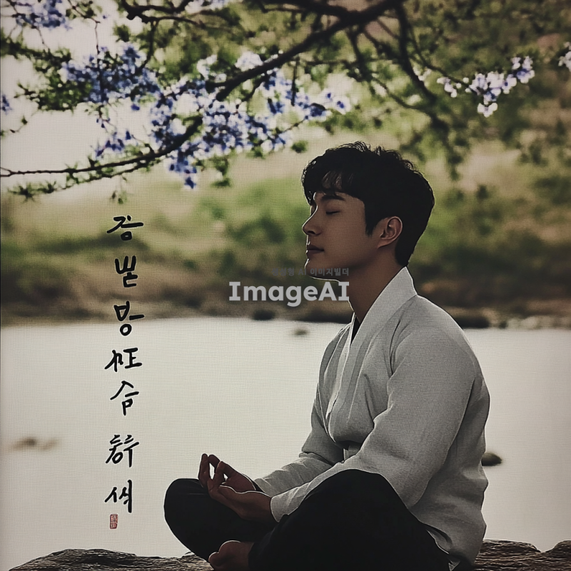 조용한 자연 속에서 편안하게 앉아 있는 한국인 남성이 명상하는 모습, 부드러운 빛이 그를 감싸고 있으며, 주변에는 푸른 숲과 흐르는 물소리가 들리는 평화로운 풍경, 마음을 진정시키는 따뜻한 색조의 조명, 고요한 분위기, 명상 음악과 어우러지는 serene한 느낌.