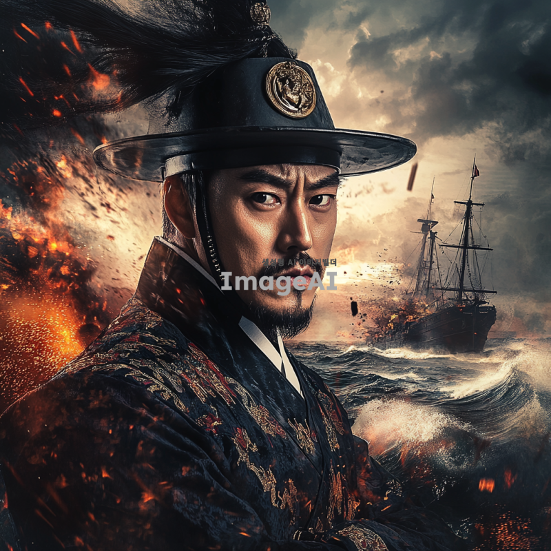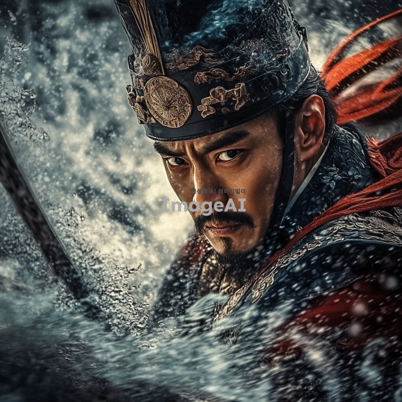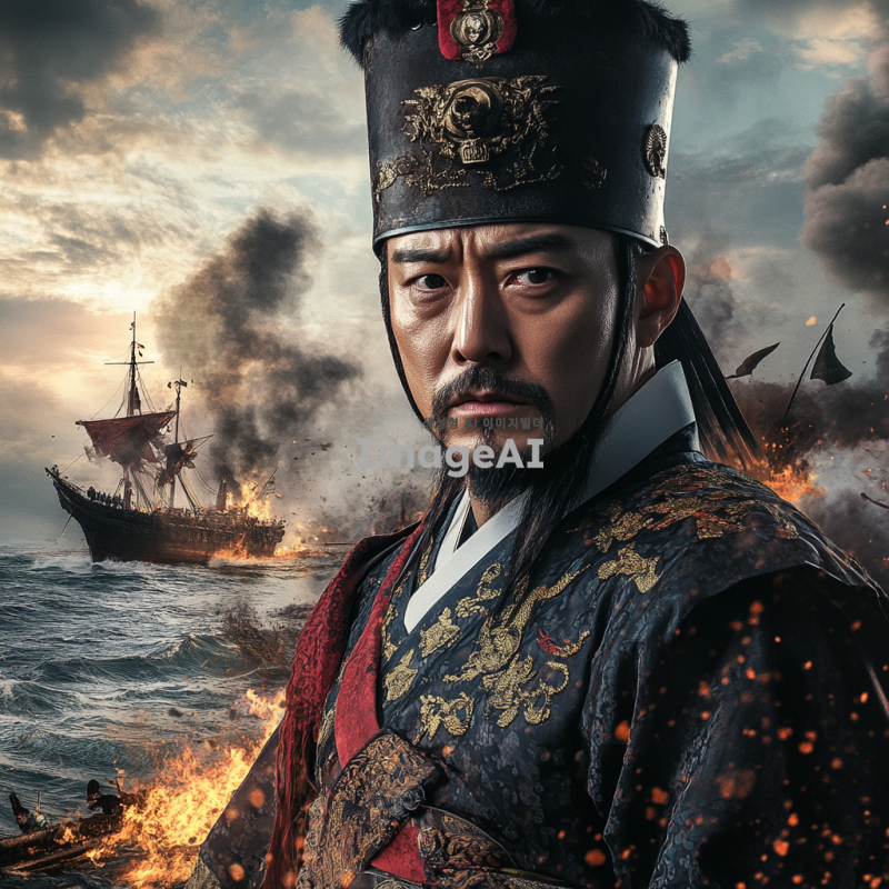 이순신 장군을 중심으로 한 역사적인 장면, 장군의 전투복을 입고 있는 모습, 강한 결단력을 지닌 표정, 전통적인 한국의 전투 배경, 동아시아의 전통적인 해양 전투, 바다와 전투선, 조선 시대의 군사적 분위기, 역동적인 포즈, 강렬한 색감, 드라마틱한 조명, 전통적인 한국의 미를 강조한 스타일.
