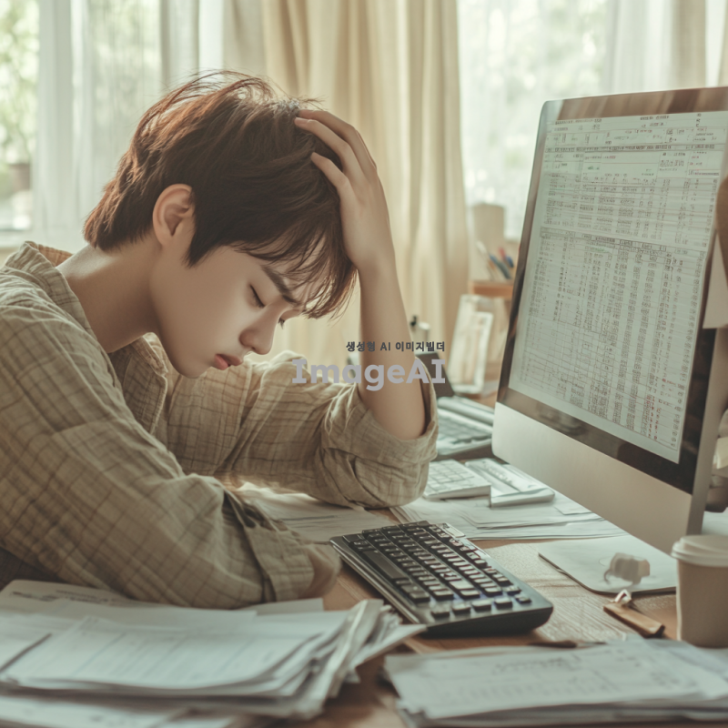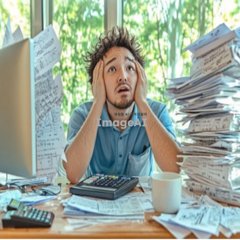 한국의 사무실에서 세금 문제로 고민하는 젊은 남성의 모습. 그는 책상에 앉아 있고, 컴퓨터 화면에는 세금 신고서와 계산기가 놓여 있다. 그의 표정은 걱정스럽고, 손에 머리를 감싸 쥐고 있다. 주변에는 서류 더미와 커피 컵이 흩어져 있어 바쁜 분위기를 자아낸다. 조명은 부드럽고 자연광이 들어오며, 현실감 넘치는 디테일로 표현해 주세요.