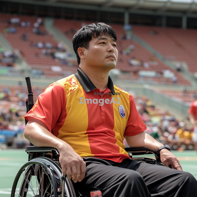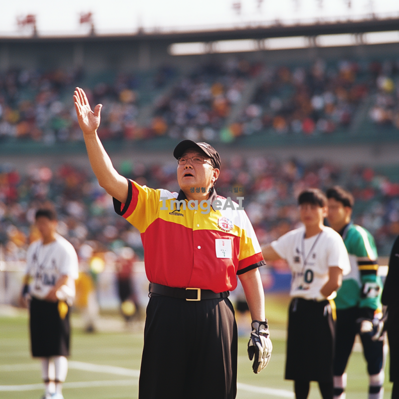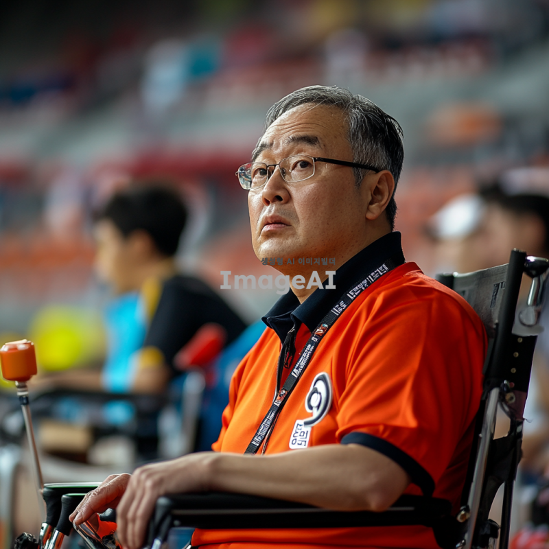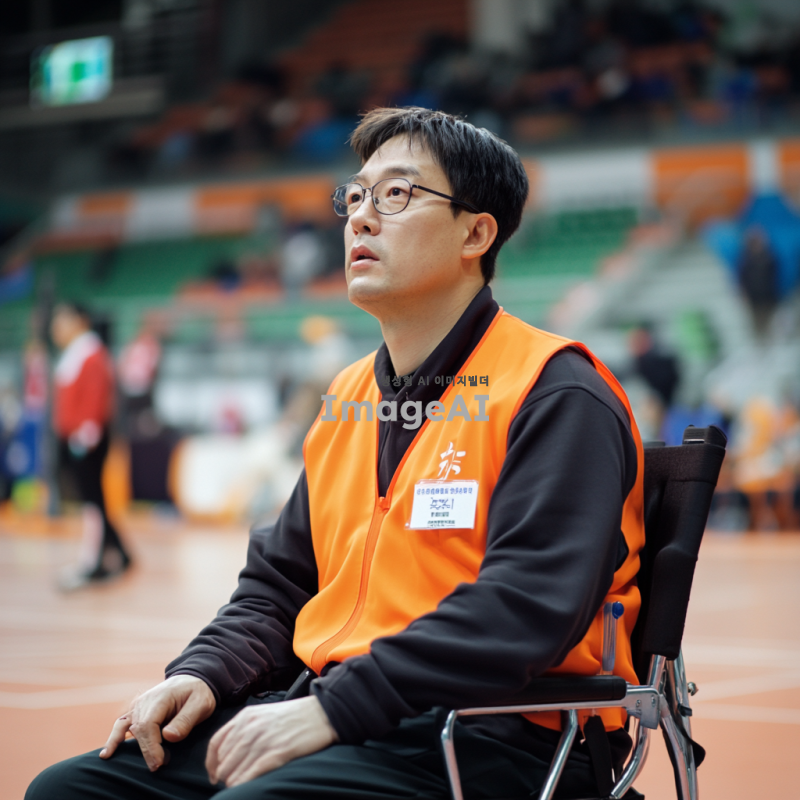 장애인 스포츠 경기에서 심판으로 활동하는 한국인, 공정하고 전문적인 태도로 경기를 관찰하며, 다양한 장애인 선수들이 경기를 펼치는 모습, 심판의 복장은 스포츠 심판의 전형적인 유니폼, 배경에는 경기장과 관중들이 있는 모습, 역동적이고 긴장감 넘치는 분위기.