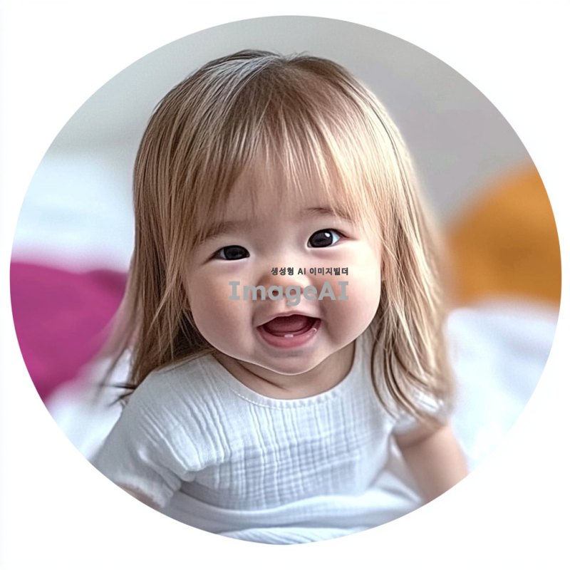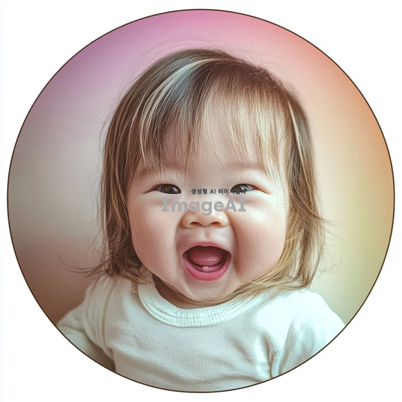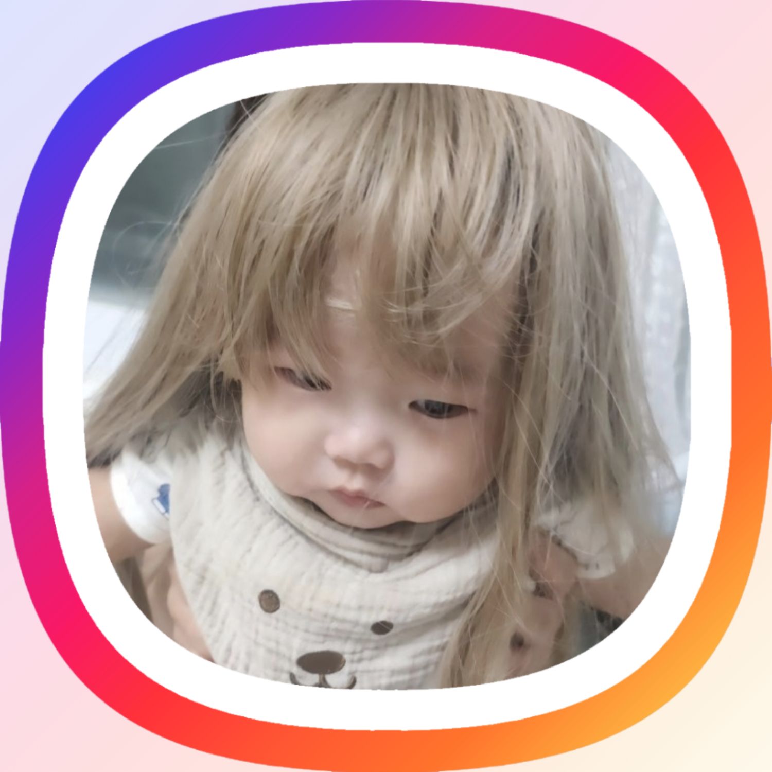 아시아계 유아의 인스타그램 프로필 사진, 긴 금발 머리, 귀엽고 행복한 얼굴, 흰색 옷을 입고 있으며, 아이콘은 다채로운 파스텔 그라데이션 배경과 미니멀하고 단순한 디자인으로 고해상도에서 하이퍼 리얼리즘을 부여합니다.