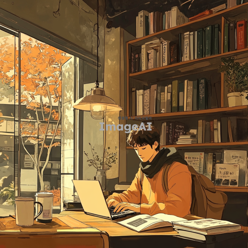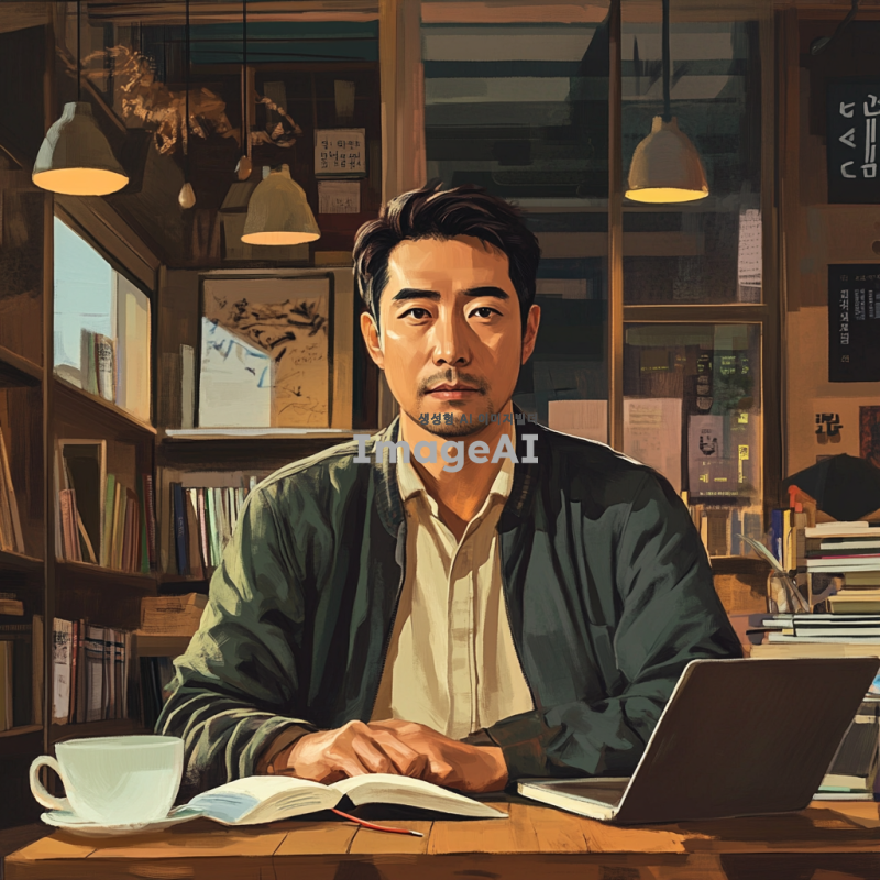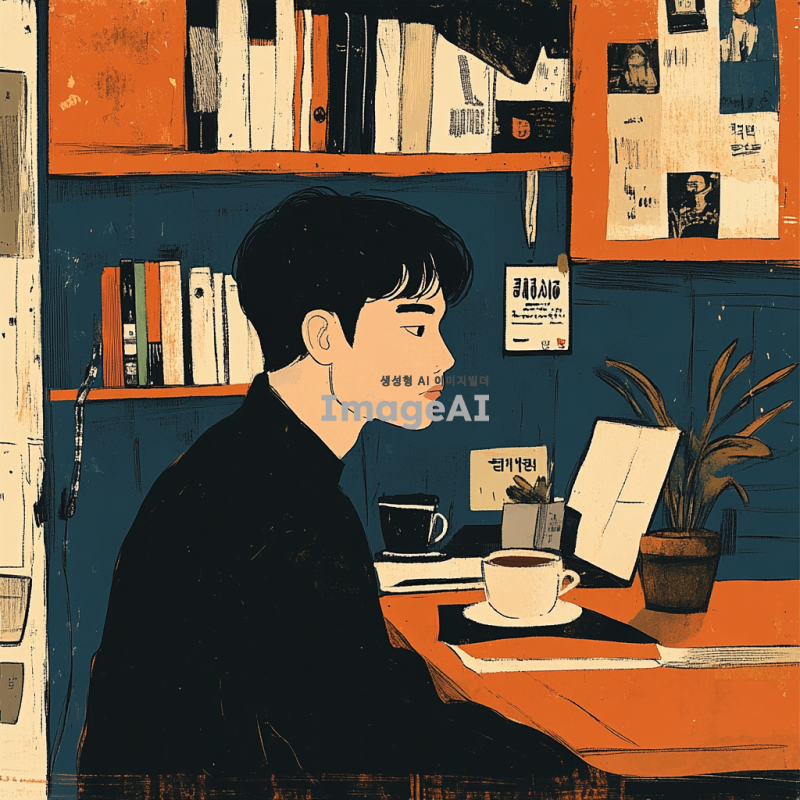카페의 타이틀 이미지로, 공부하는 순간에 결실을 향해 첫 발을 내딛는 모습을 담고 있습니다. 절박함과 학습의 과정을 강조하며, 도전 의지를 가진 한국 남성이 홀로 서기 위해 노력하는 모습이 그려집니다. 배경에는 기술과 규율을 통해 성장하는 과정을 상징적으로 나타내기 위해 커피 컵, 책, 노트북이 따뜻한 카페 분위기와 조화를 이루고 있습니다.