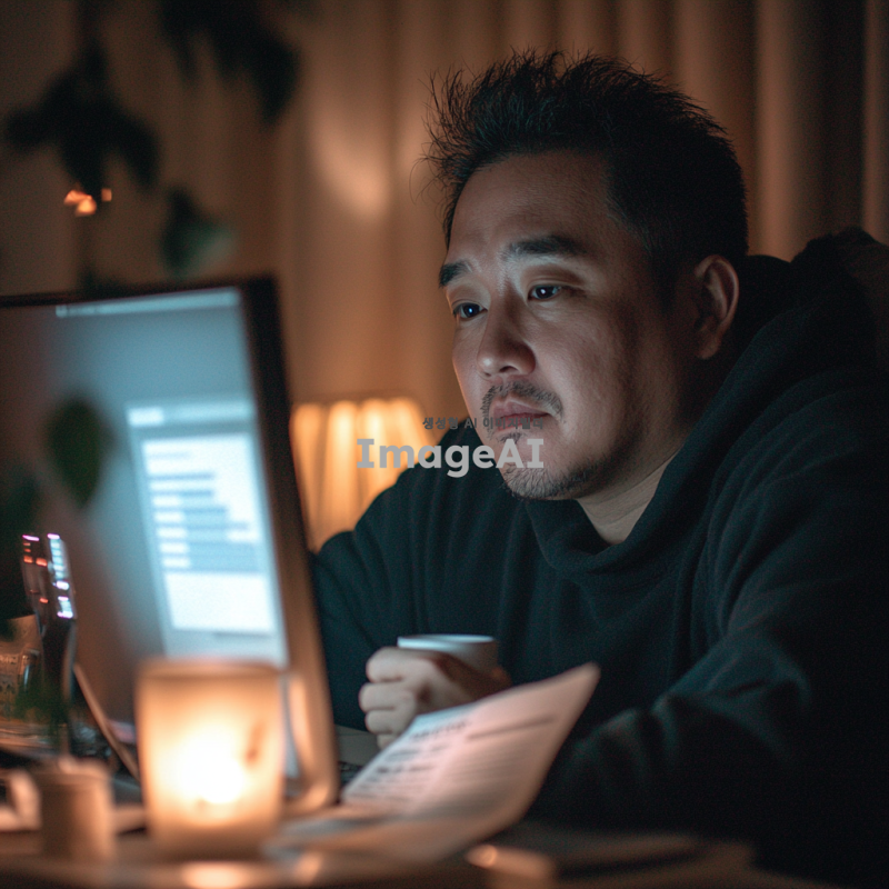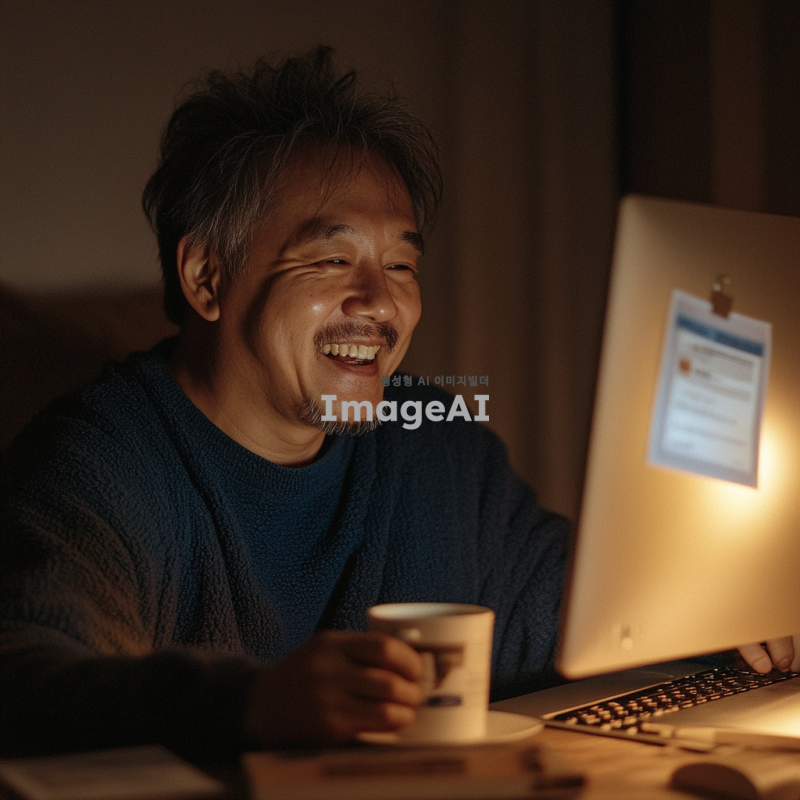 어두운 방 안에서 빛나는 컴퓨터 화면을 바라보며 행복한 표정을 짓고 있는 한국인 남성. 화면에는 세금 환급 금액이 표시되어 있고, 그의 얼굴에는 안도감과 기쁨이 가득하다. 방 안에는 월세 고지서가 놓여 있고, 그가 내일 렌트비를 걱정하지 않아도 되는 상황을 표현. 주변은 따뜻한 조명으로 아늑한 분위기를 연출하고, 남성의 손에는 커피 컵이 들려 있다.