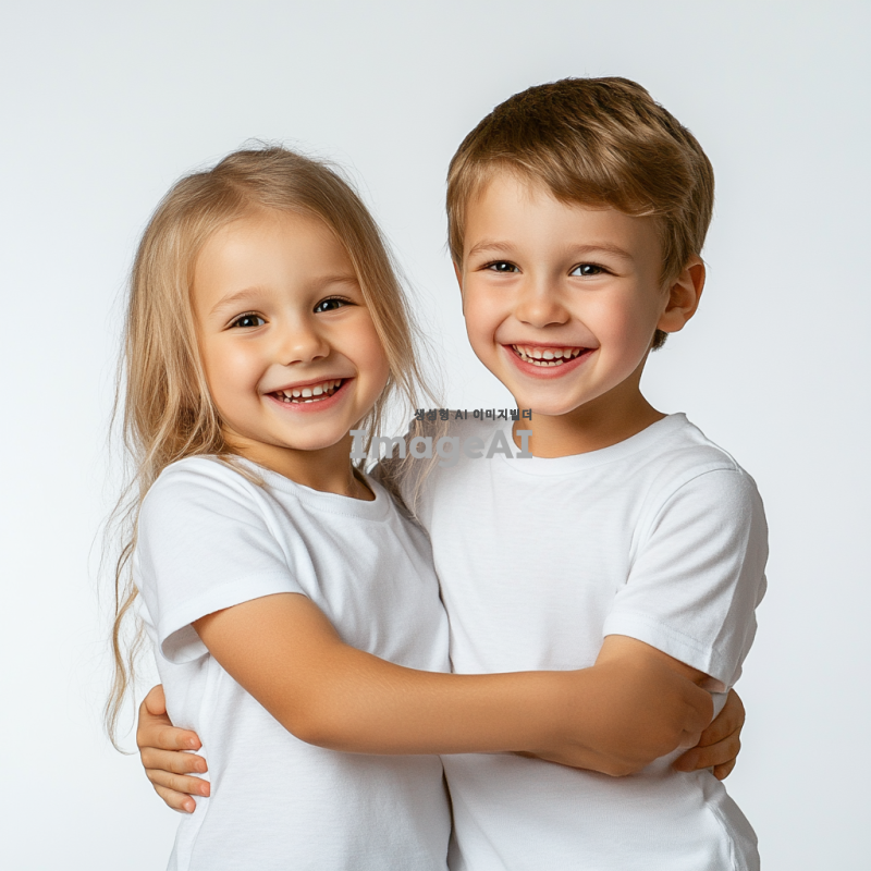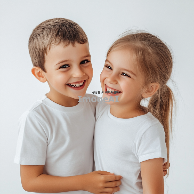 6살 남자아이와 여자아이가 흰색 티셔츠를 입고 환하게 웃으며 함께 놀고 있는 모습. 배경에는 흰색 스튜디오