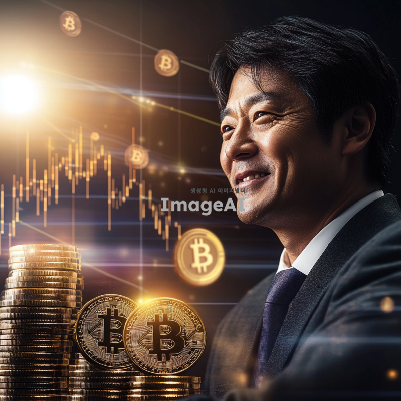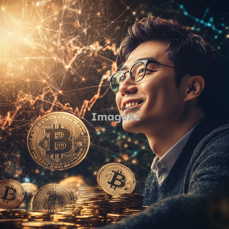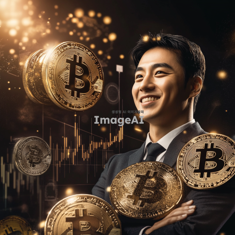 비트코인 웰컴 보너스를 주제로 한 이미지, 현대적인 느낌의 디지털 환경 속에 금색 비트코인 동전이 반짝이며 쌓여 있는 모습, 배경에는 블록체인 그래픽과 상승하는 차트가 어우러져 있고, 한국인 남성이 기뻐하는 표정을 지으며 동전을 바라보는 장면, 밝고 희망적인 분위기, 테크놀로지와 재정의 결합을 강조한 디자인.