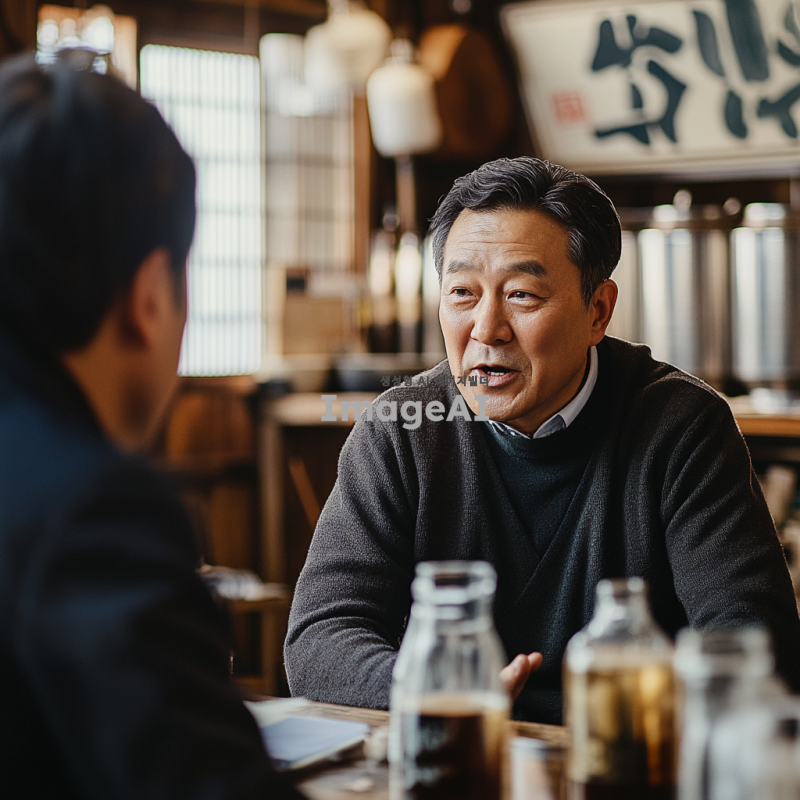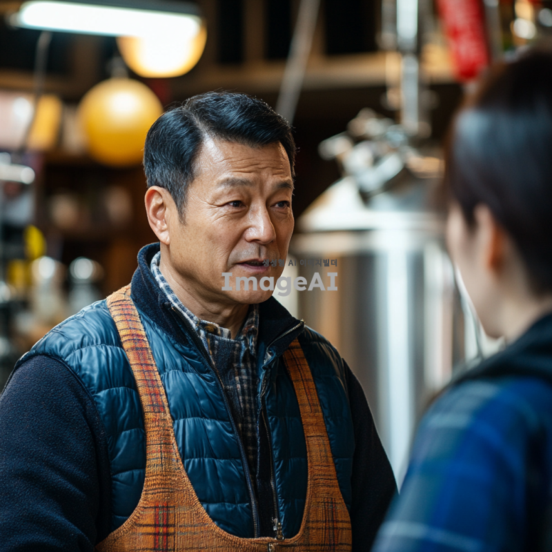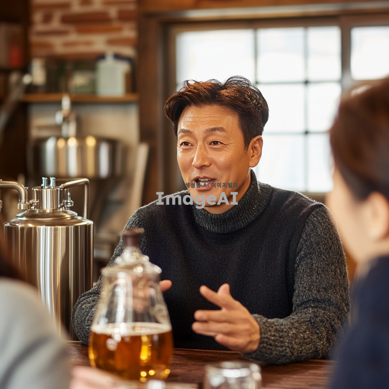 40대 한국 남성이 양조장에서 인터뷰를 진행하는 장면, 전통 한국 양조장의 내부 모습, 다양한 양조 기구와 재료들이 배치되어 있는 환경, 남성은 진지한 표정으로 인터뷰 대상과 대화하고 있는 모습, 자연광이 들어오는 따뜻한 분위기, 전통적인 한국의 문화 요소가 담긴 배경