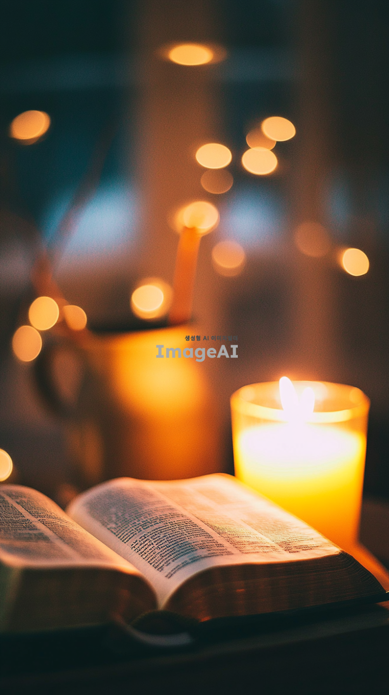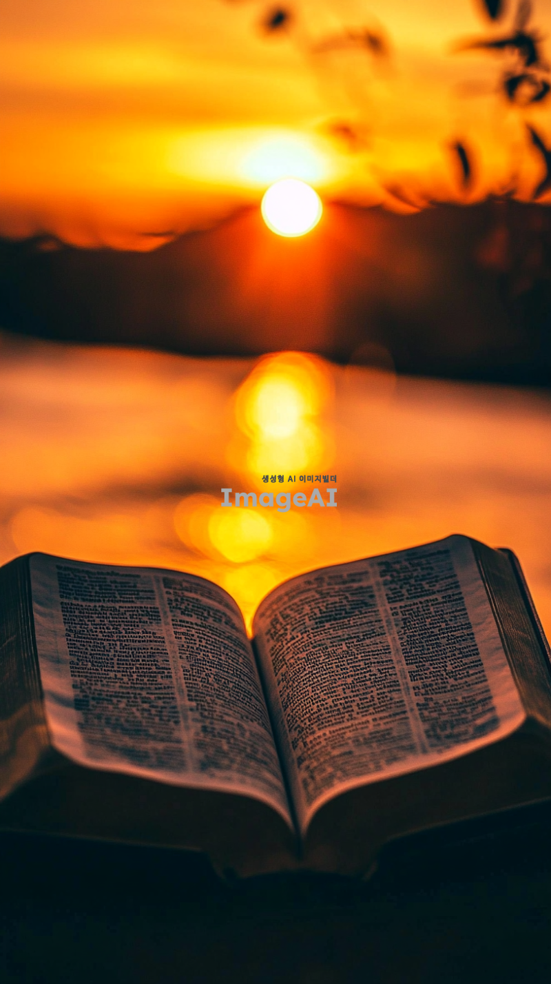 따뜻한 빛이 비추고 음악이 흐르는 배경에 성경이 펼쳐져 있고, 성경 뒤로는 하느님과 이스라엘 백성들이 이야기를 나누고 있는 모습, 따뜻하고 거룩한 분위기
