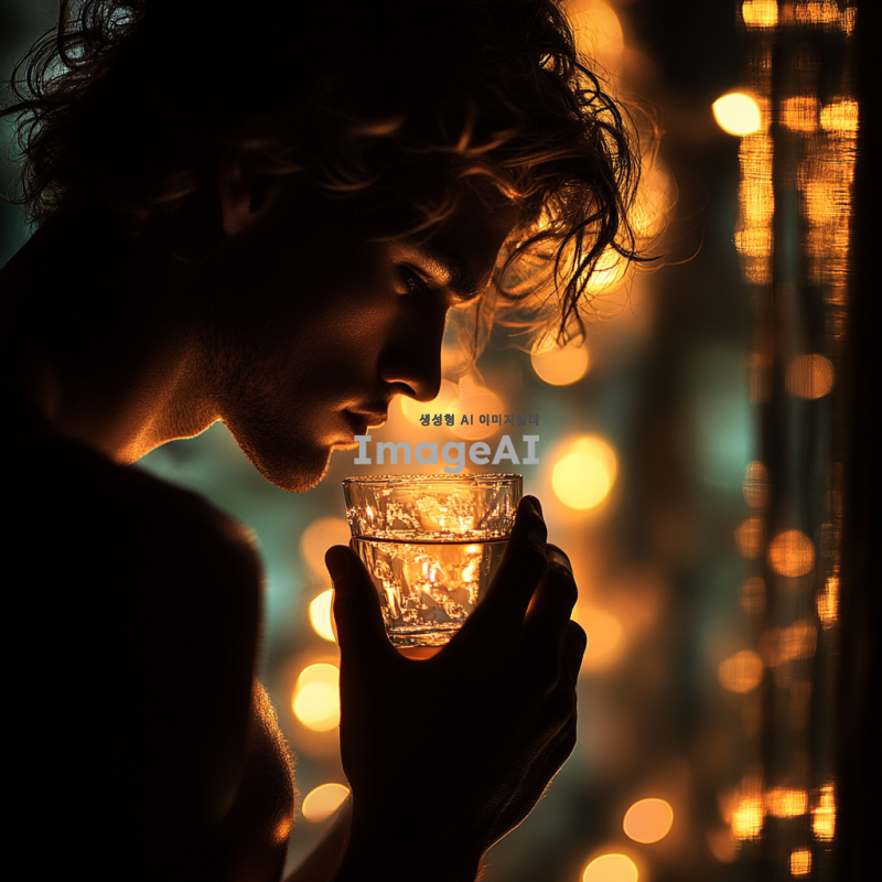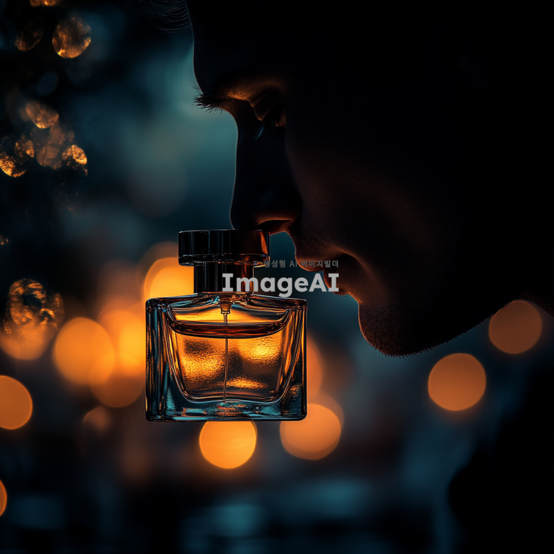 어두운 공간에서 여자 향수를 맡고 있는 남자의 모습, 남자는 깊은 생각에 잠겨 있으며, 주변은 흐릿한 조명으로 감싸여 있다. 그의 표정은 상념에 잠긴 듯하며, 향수의 향기가 그를 매료시키고 있는 듯한 느낌을 주고 있다. 배경은 어둡고 신비로운 분위기를 연출하며, 남자의 실루엣이 강조된다.
