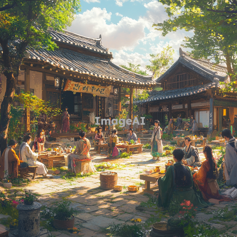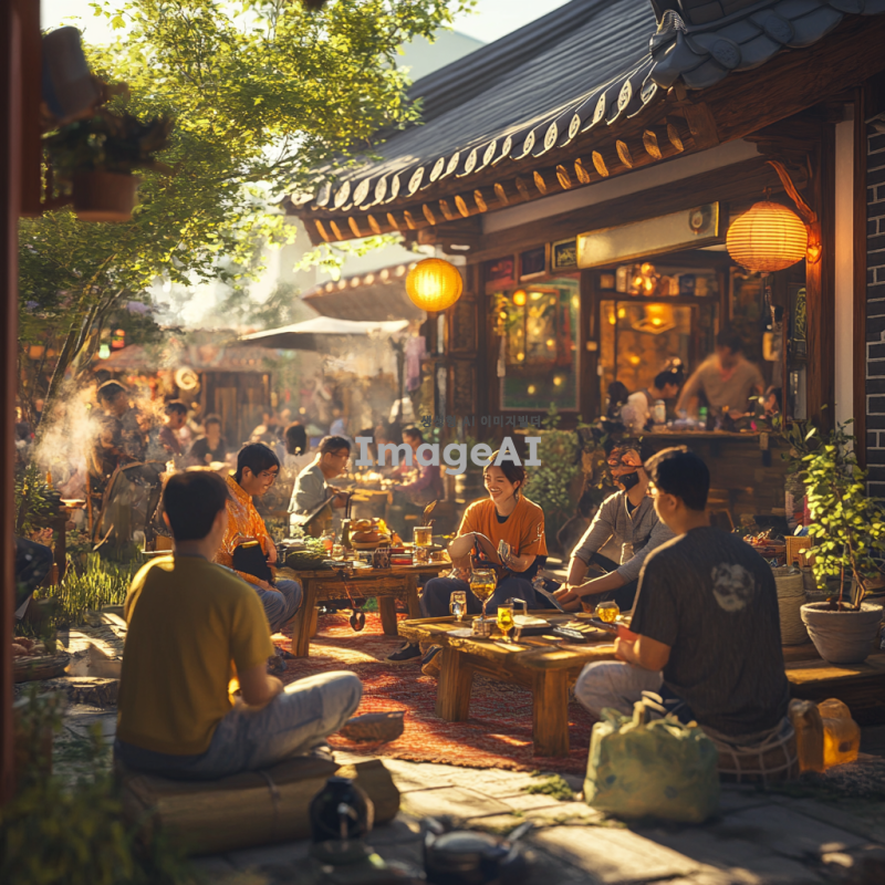 40대 한국인들이 Valorant 게임을 즐기기 위해 모인 클랜 회의의 외부 풍경, 사람들이 게임을 하고 있는 모습, 다양한 표정과 활동이 담긴 장면, 자연스러운 대화와 웃음이 오가는 분위기, 게임 관련 소품과 장비가 배치된 환경, 따뜻한 햇살 아래에서의 활기찬 모습