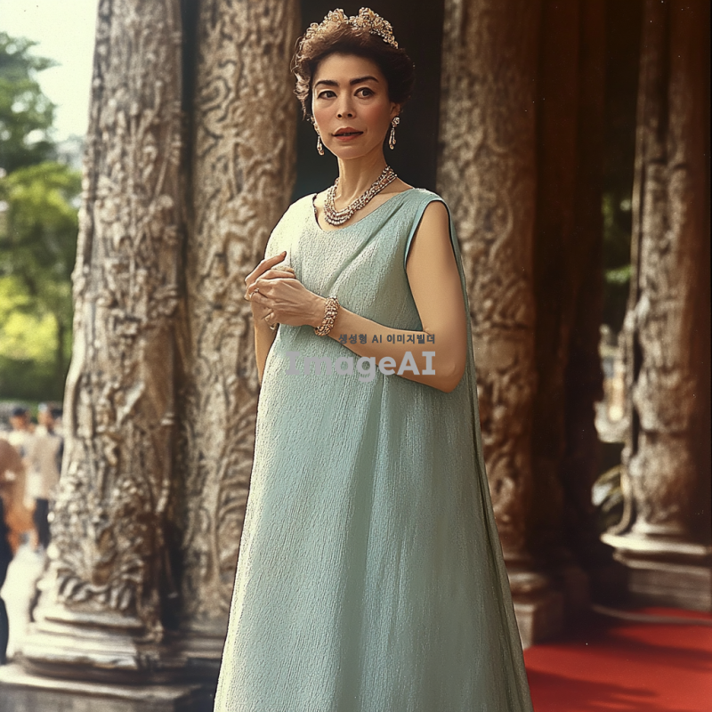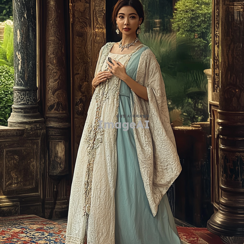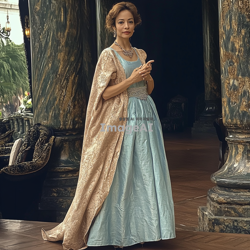 궁전에서 화려한 드레스를 입은 전신 사진 어울리는 주얼리도 함께