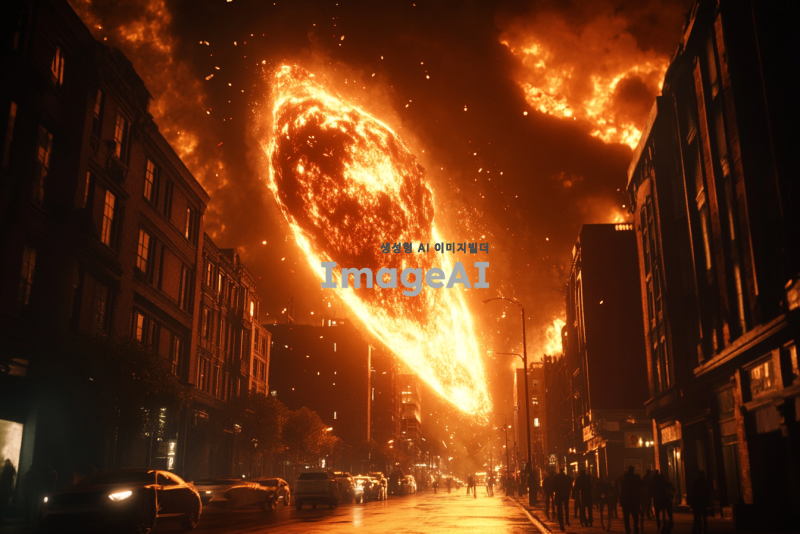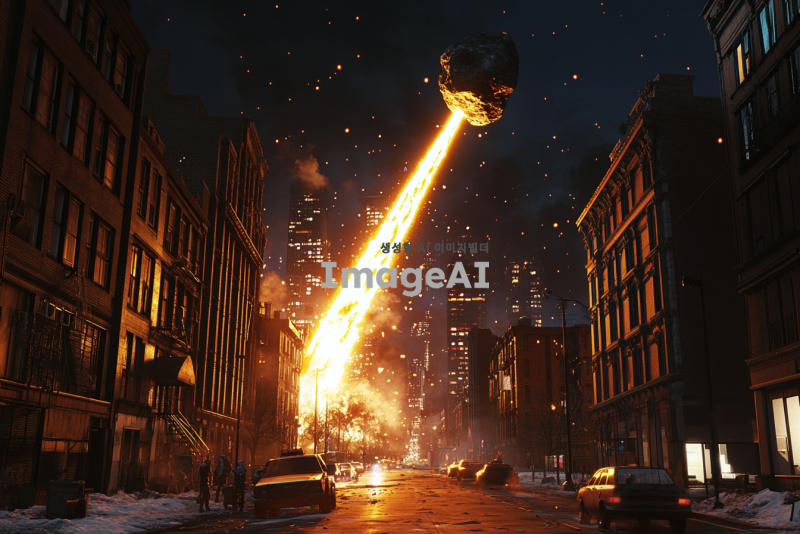 어두운 밤하늘에 소행성이 도시 위로 떨어지는 장면, 소행성이 대기권에 진입하면서 불타오르고 있는 모습, 도시의 고층 건물들이 흔들리며 붕괴되는 모습, 거리에는 혼란에 빠진 사람들과 차량들이 있는 모습, 배경에는 불길과 연기가 가득한 하늘, 긴장감 넘치는 분위기, 사실적인 스타일로 표현된 이미지