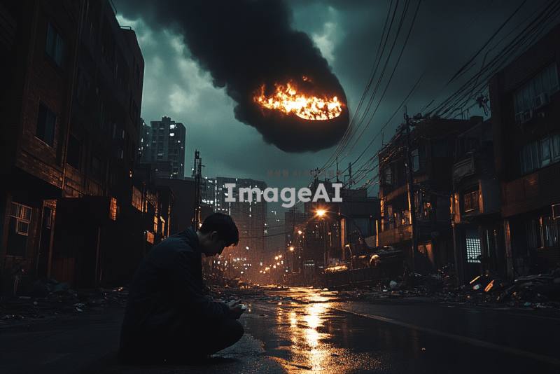 이미 망한 어두운 도시 길가 위에서 슬퍼하고 있는 한 남자.