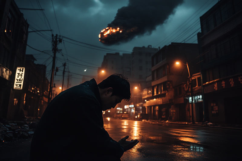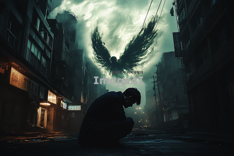 어둡고 황폐한 도시의 거리에서 슬픔에 잠긴 한 남자의 뒷모습, 그의 뒤로 신비로운 천사의 그림자가 드리워져 있는 장면. 도시의 건물들은 낡고 부서져 있으며, 흐릿한 조명이 어두운 분위기를 더하고 있다. 남자는 고개를 숙이고 있으며, 그의 주변에는 쓸쓸한 느낌이 감돈다. 천사의 그림자는 남자의 슬픔을 위로하는 듯한 모습으로, 부드러운 빛이 그 주위를 감싸고 있다.
